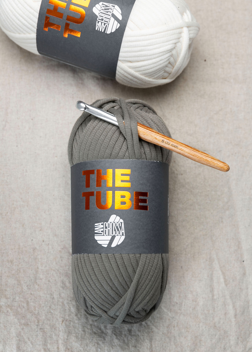 Lana Grossa-Qualität „The Tube“ (60 % Baumwolle, 40 % Nylon, LL = ca. 114 m/200 g): ca. 10 g in Creme (Fb. 2) oder Khaki (Fb. 13); 1 Häkelnadel Nr. 7; Wollnadel