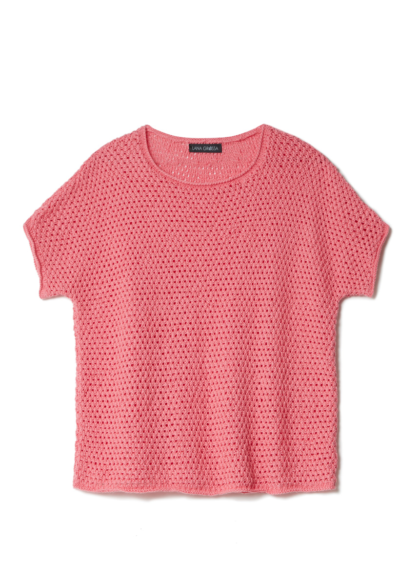 Lana Grossa „Campo“ (65% Baumwolle, 25% Viskose, 10% Leinen, LL = 165 m/50 g): 200 (200 - 250) g in Nelkenrosa (Fb. 15); Stricknd Nr 3,5 und Nr 5, 1 Rundstricknd Nr 3, 40 cm lang.
