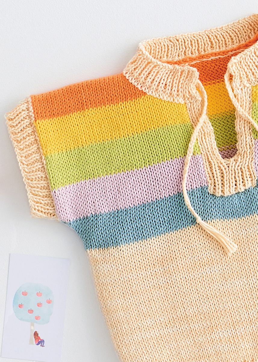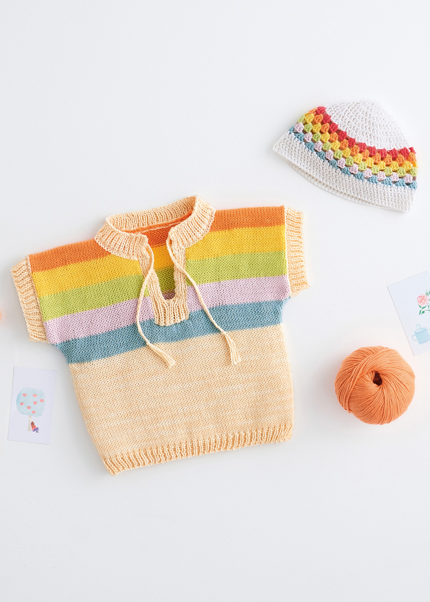Lana Grossa Cotton Love (100 % Baumwolle (Bio), Lauflänge 170 m/50 g) 50 (100/100/100) g Creme (Fb 11), 50 g Mint (Fb 24), 50 g Pastellrosa (Fb 22), 50 g Gelbgrün (Fb 6), 50 g Gelb (Fb 7) und 50 g Orange (Fb 1); Stricknadel Nr. 3 und 3,5, eine 40 cm lange Rundstricknadel Nr. 3.