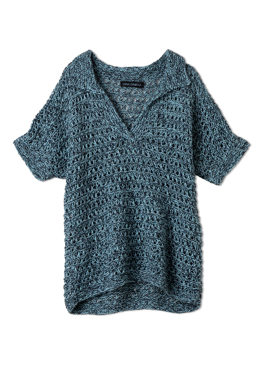 Lana Grossa Ecopuno (72% Baumwolle, 17% Schurwolle (Merino), 11% Alpaka (Baby), Lauflänge 215 m/50 g), 200 (200 - 250 - 250) g in Helltürkis (Fb 77) und Filo Paillettes (55% Baumwolle, 39% Polyester, 6% Polyamid, Lauflänge 155 m/50 g), 250 (300 - 350 - 350) g in Nachtblau (Fb 15); Stricknadeln Nr 5 und Nr 6, je 1 Rundstricknadel Nr 4,5 und Nr 5, 40 cm lang.