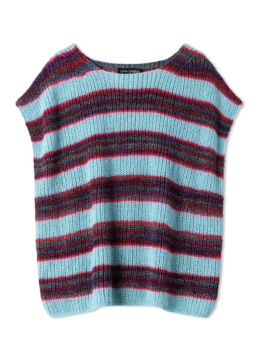 Extraweit, im Halbpatentmuster und mit Streifen im Farbverlauf: Dieses Shirt gefiel uns so gut, dass wir es in zwei verschiedenen Varianten stricken mussten. Seine gerade Silhouette ist anfängerfreundlich, der Ausschnitt entsteht durch betonte Abnahmen.
