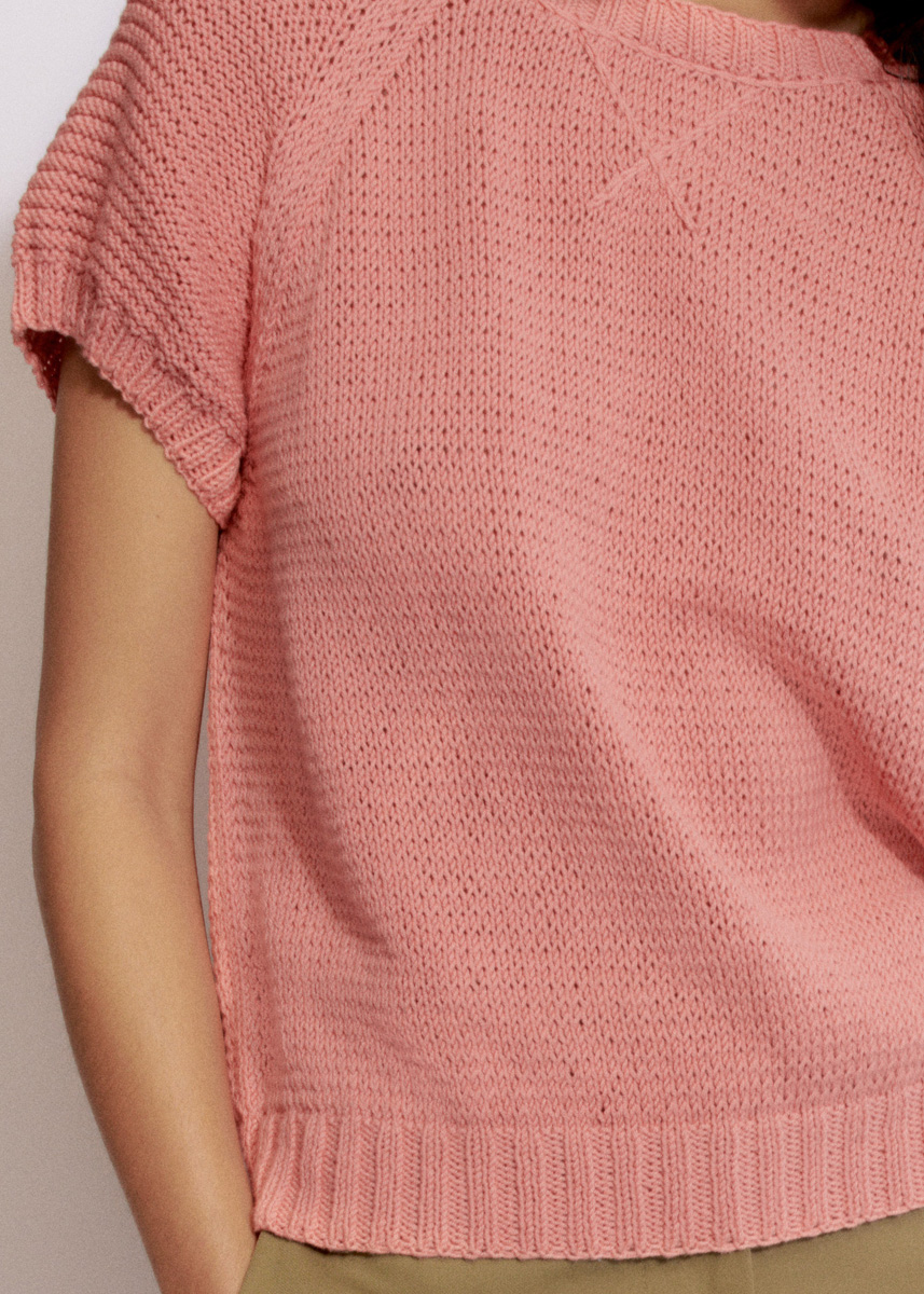 Lana Grossa Elastico (96% Baumwolle, 4% Polyester (Elité), Lauflänge 160 m/50 g), 250 (300 – 300) g Lachs (Fb 132); Stricknadeln Nr. 3,5, 4 und 5,5, 1 Rundstricknadel Nr. 3,5, 40 cm lang und 1 Häkelnadel Nr. 3,5.