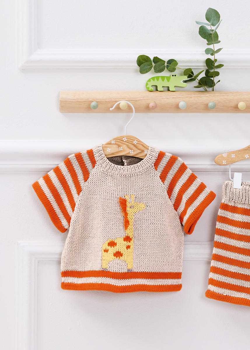Lana Grossa-Qualität „Elastico“ (96 % Baumwolle, 4 % Polyester (Elité); Lauflänge = 160 m / 50 g): 100 (100/150/200) g Beige (Fb 97), 50 (50/100/100) g Orange (Fb 169), je 50 g Rapsgelb (Fb 180) und Grège (Fb 103); je eine Rundstricknadel 3,5 mm und 4 mm; Häkelnadel 3,5 mm; 3 Druckknöpfe mit 8 mm Ø. Hinweis: Für die Kombination Kurzarmpulli und Shorts reichen 150 (150/200/200) g von dem Garn in Beige (Fb 97) aus.