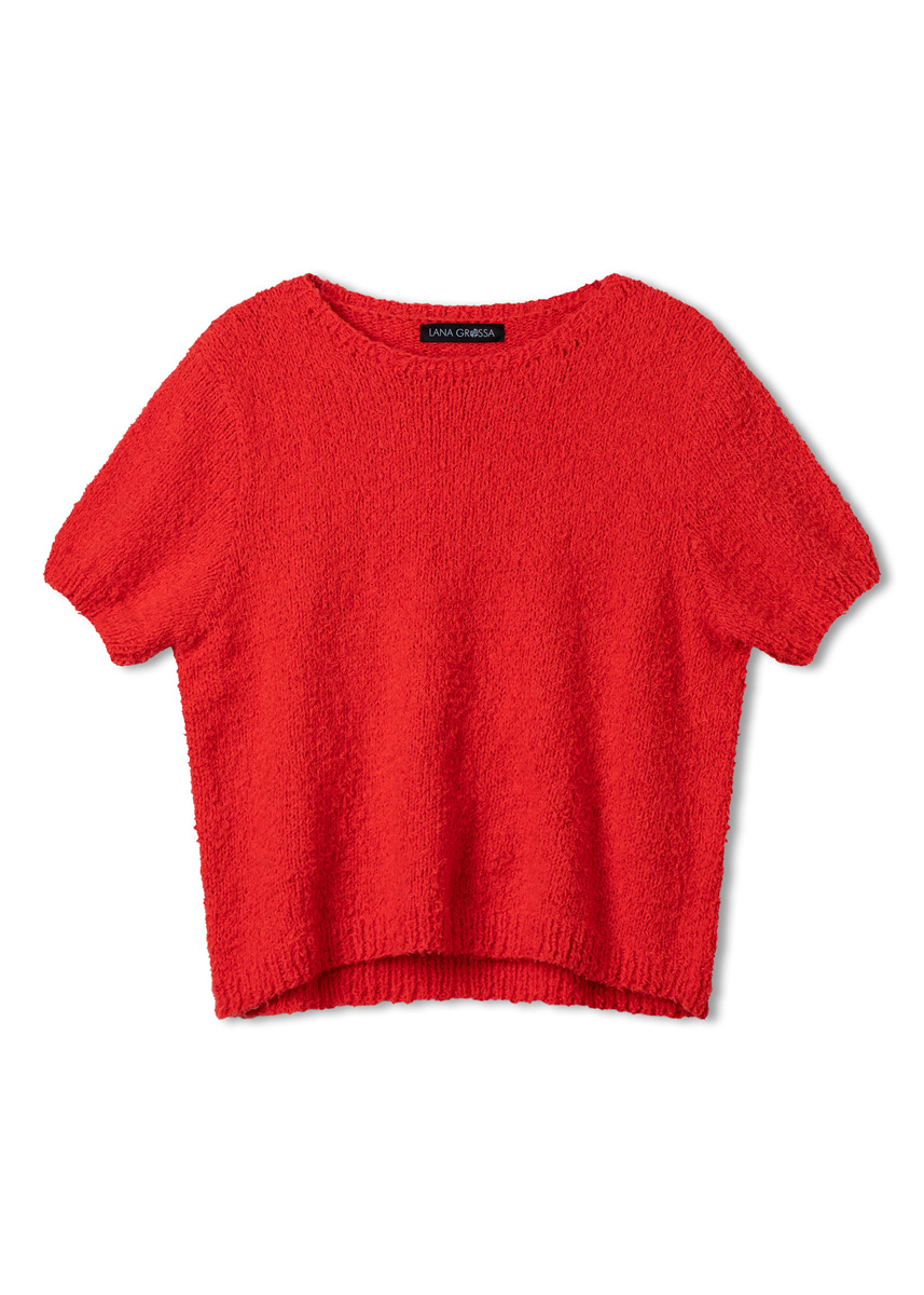 Lana Grossa Ella (100% Baumwolle, Lauflänge 130 m/50 g), 300 (350 - 400 - 450) g in Rot (Fb 11); Stricknadeln Nr 4,5, 1 Rundstricknadel Nr 4,5, 40 cm lang.