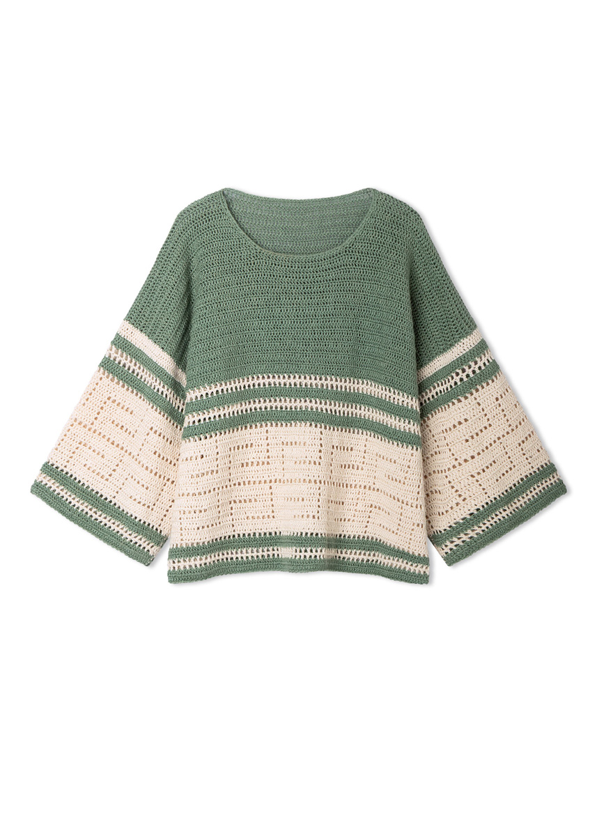 Lana Grossa-Qualität „Summer Cashmere” (90 % Baumwolle, 10 % Kaschmir, LL = ca. 210 m/50 g): ca. 300 g Creme (Fb. 2) und ca. 150 g Resedagrün (Fb. 23); 1 Wollhäkelnadel Nr. 3.