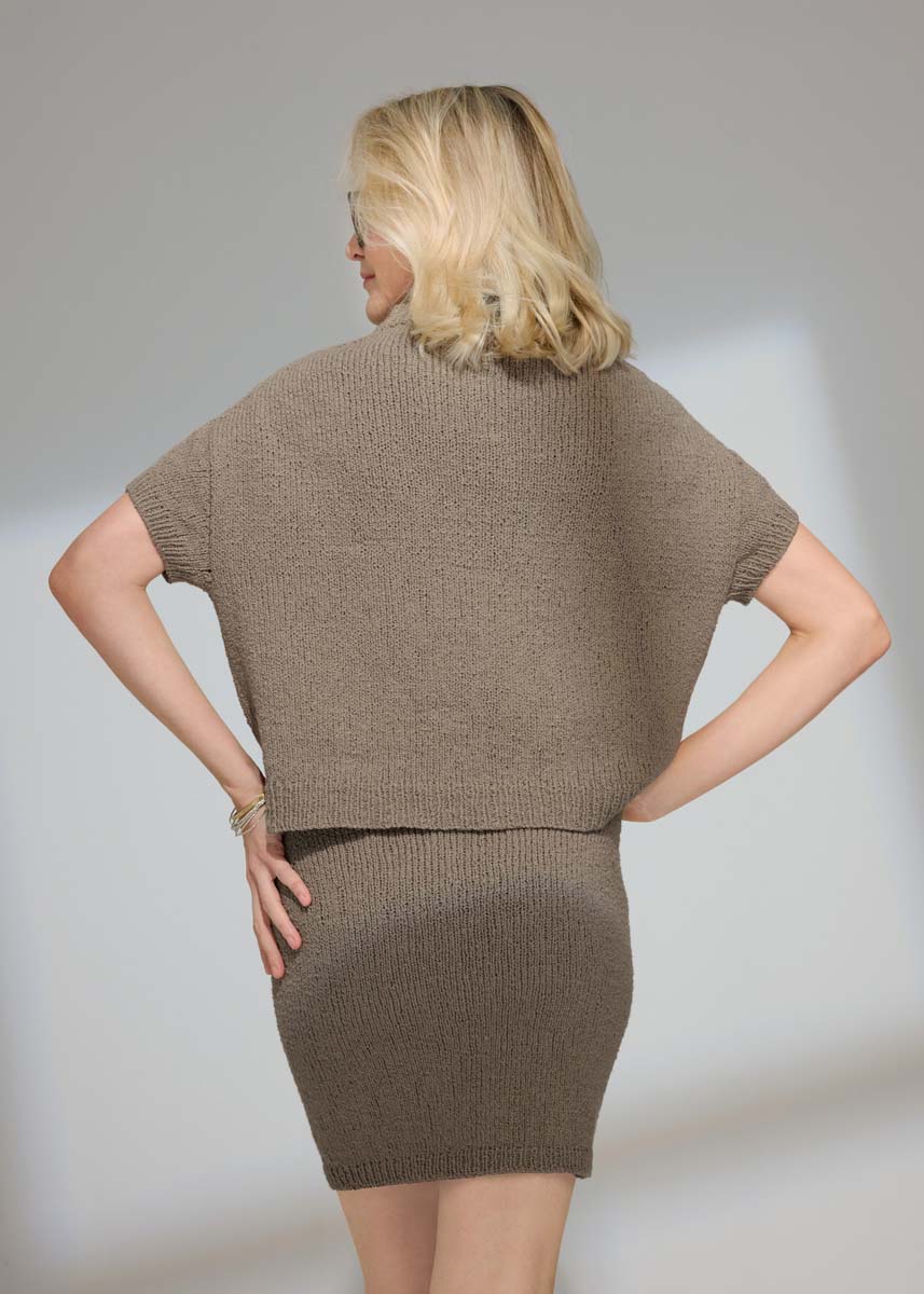 Die rückwärtige Erhöhung wird mithilfe verkürzter Reihen geformt. Anschließend wird über alle Maschen in Runden weitergestrickt. Für die Hüftausformung erfolgen gleichmäßig verteilte Zunahmen. Der Rock wird mit einem Bündchen abgeschlossen und schließlich italienisch abgekettet.