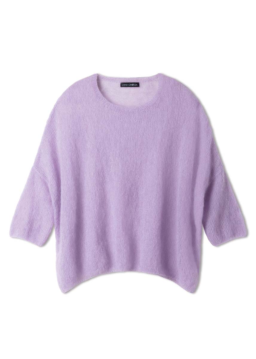 Lana Grossa-Qualität „Silkhair“ (70 % Mohair (Superkid), 30 % Seide, LL = ca 210 m/25 g): ca 125 (125 - 150 - 150) g Flieder (Fb 173); Stricknadeln Nr 3,5 und Nr 4; 1 kurze Rundstricknadel Nr 3,5.