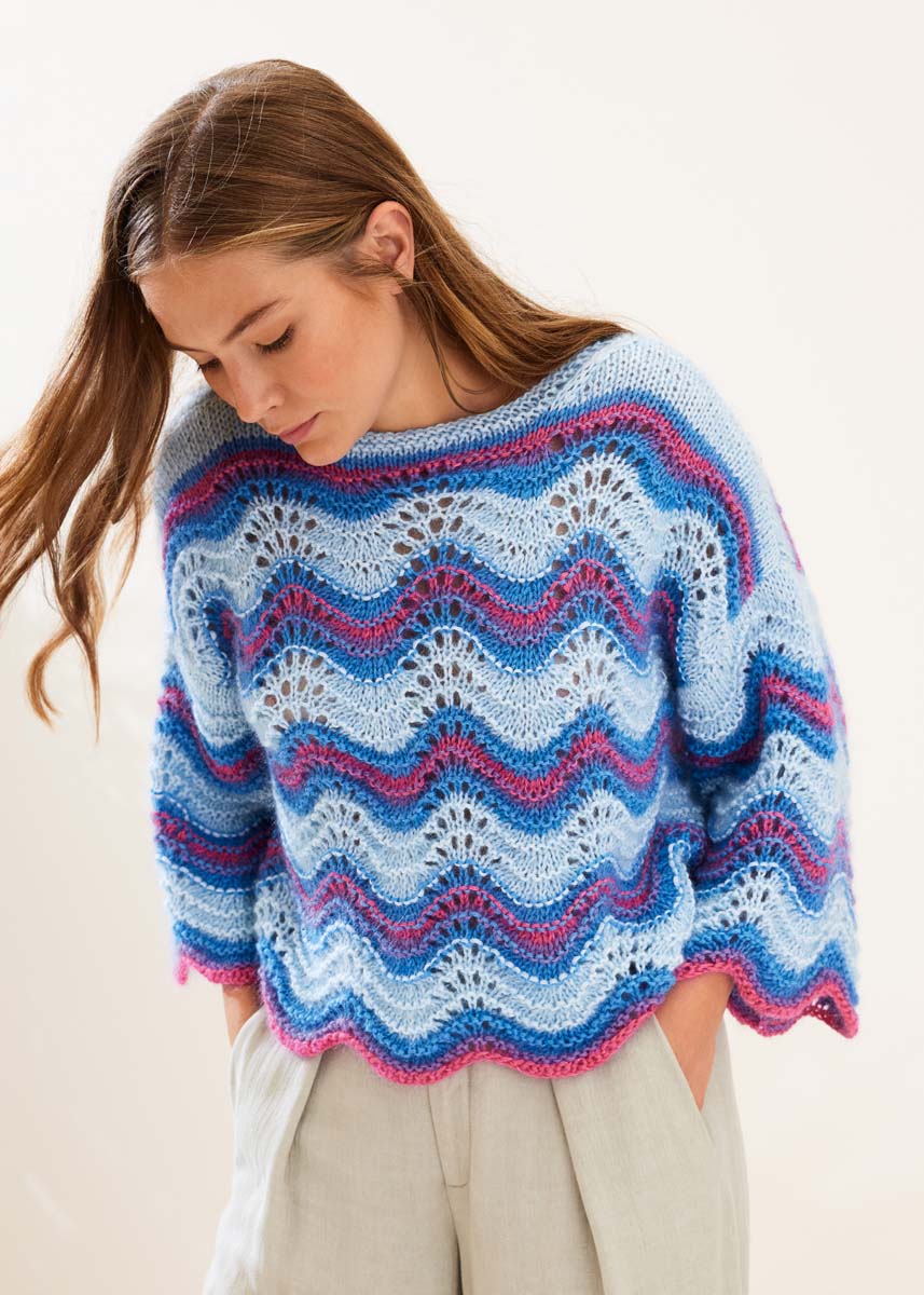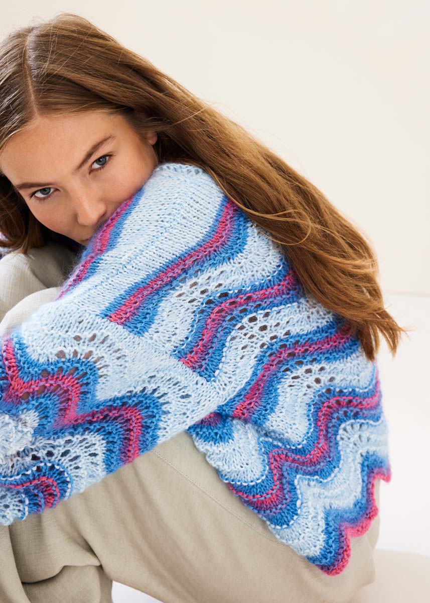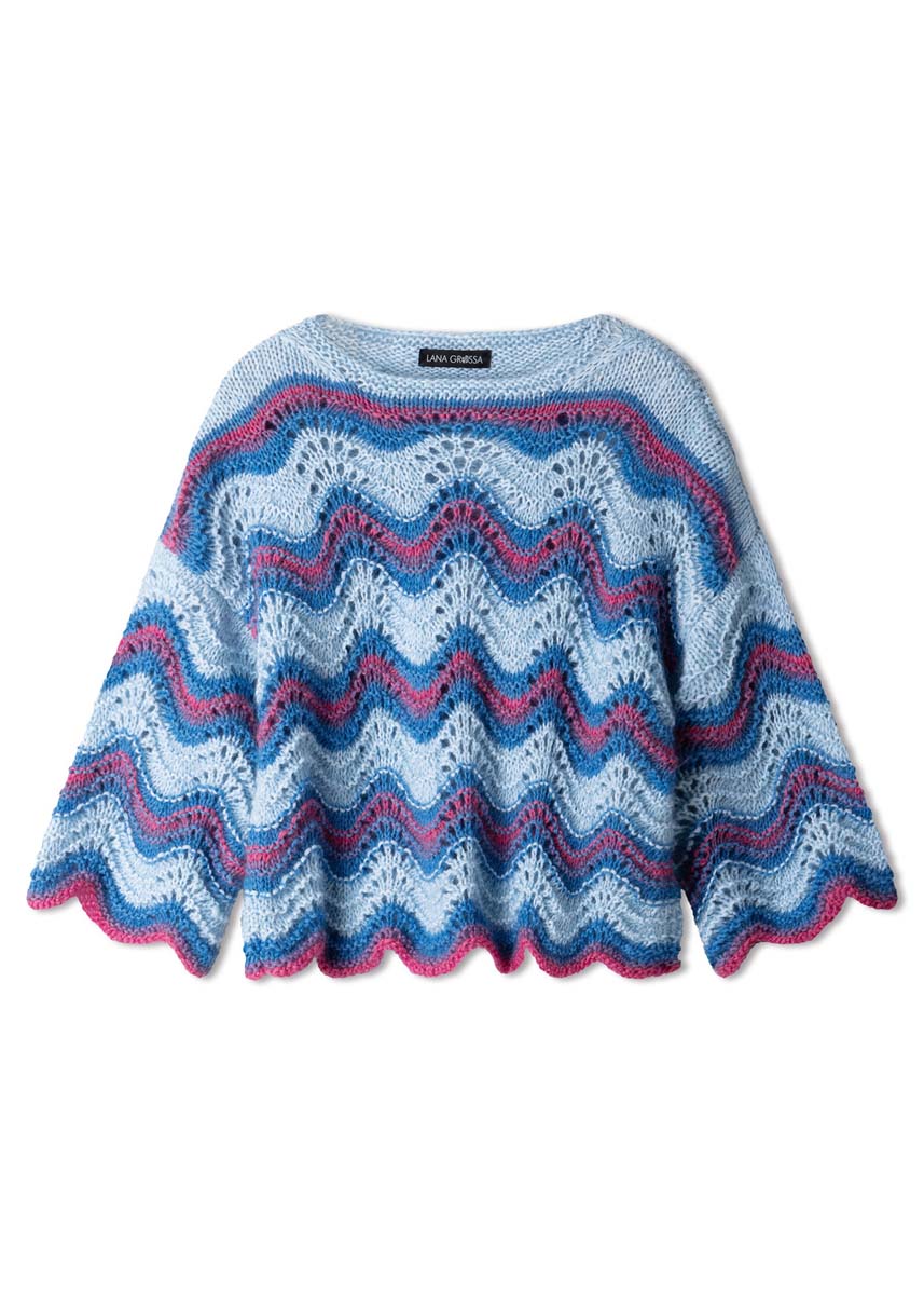 Lana Grossa-Qualität „Silkhair“ (70 % Mohair (Superkid), 30 % Seide, LL = ca 210 m/25 g): ca 25 (25) g Fuchsia (Fb 172), ca 25 (25) g Lavendel (Fb 163), ca 75 (75) g Zartblau (Fb 201) und ca 50 (50) g Kornblume (Fb 132); Lana Grossa-Qualität „Summer Softness“ (80 % Baumwolle (Bio), 20 % Schurwolle (Merino Superfine), LL = ca 130 m/50 g): ca 50 (100) g Pink (Fb 8), ca 50 (100) g Lila (Fb 9), ca 200 (250) g Pastellblau (Fb 17), ca 150 (200) g Jeansblau (Fb 16); Stricknadeln Nr 6; 1 kurze Rundstricknadel Nr 5,5.