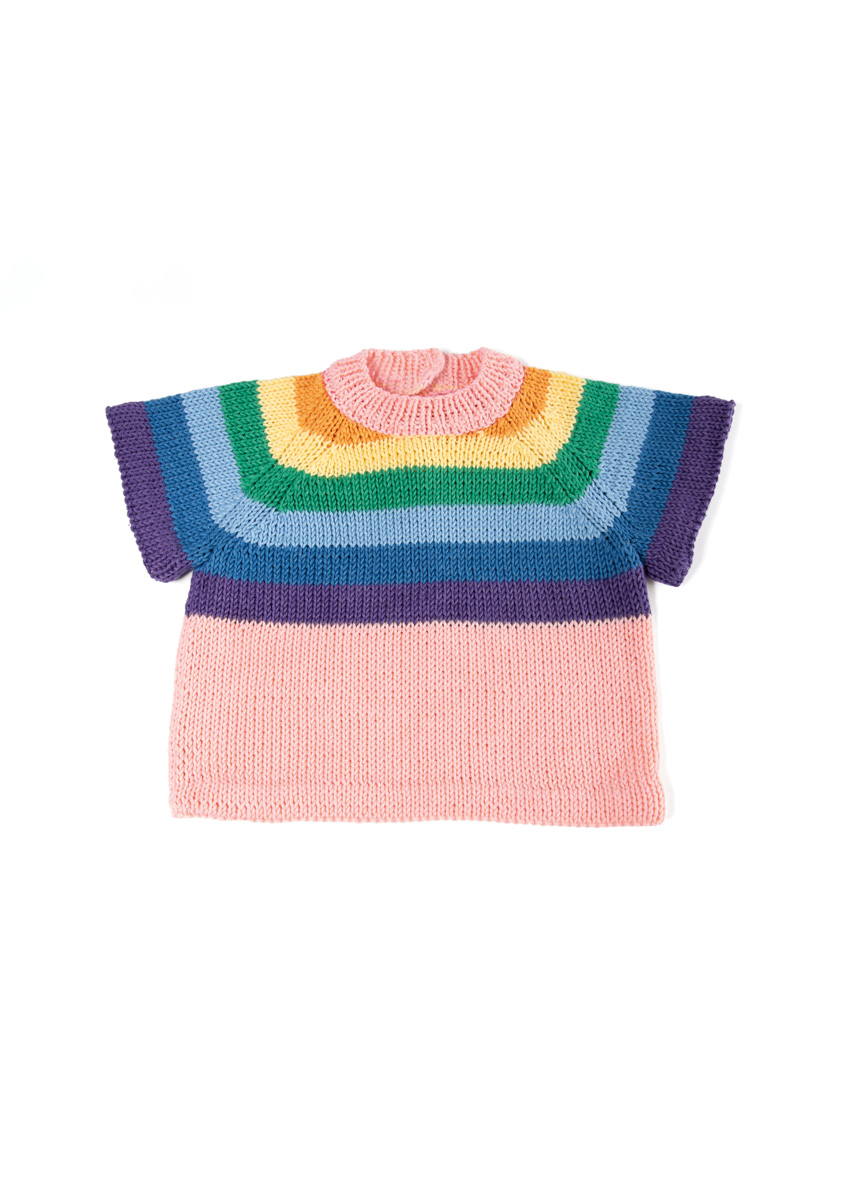Lana Grossa Soft Cotton (70% Baumwolle, 30% Polyacryl; LL = 140 m/50 g): 50 (100/100/100) g Rosa (Fb. 6) und je 50 g Orange (Fb. 59), Gelb (Fb. 11), Himmelblau (Fb. 47), Blau (Fb. 28), Jadegrün (Fb. 51) und Anthrazitviolett (Fb. 53); je eine Rundstricknadel 3,5 mm und 4 mm; entfernbare Maschenmarkierer (alternativ Sicherheitsnadeln); 3 durchsichte Druckknöpfe zum Annähen.