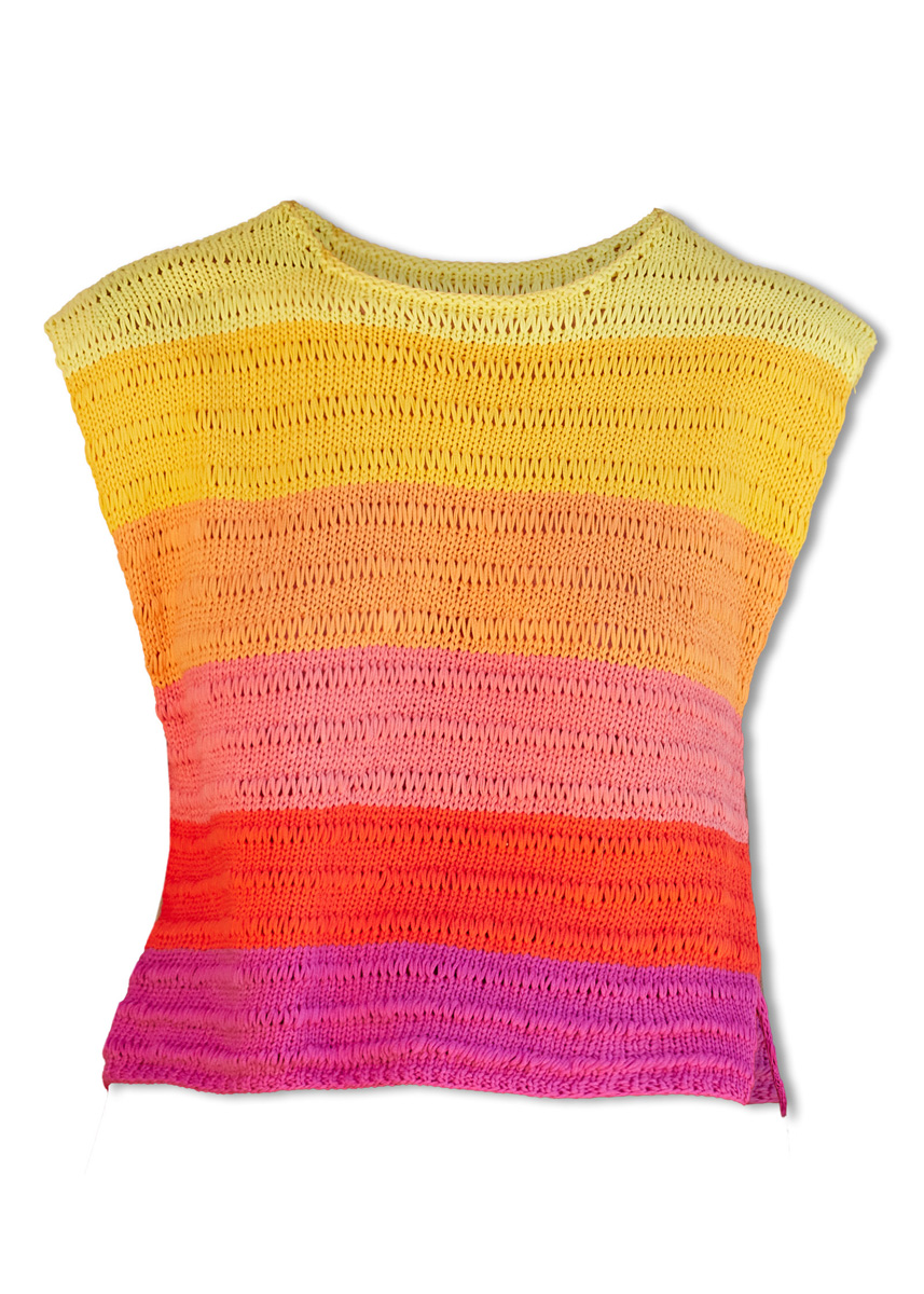 Beim Top in Sunset-Farben erzeugen glatt rechts gestrickte Passagen im Wechsel mit zwei Reihen Fallmaschen den interessanten Stripe-in-Stripe-Effekt, der das Colourblocking besonders schön betont. Typisch TESSERA: die pudrig-matte Optik. Die Seitenschlitze sind ein hübsches Detail.