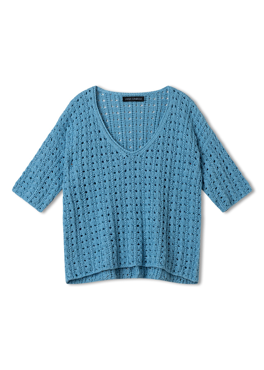 Lana Grossa Tessera (100% Baumwolle, Lauflänge 115 m/50 g), 400 (450 - 500) g in Himmelblau (Fb 13); Stricknadeln Nr 5, 1 Rundstricknadel Nr 5, 50 cm lang.