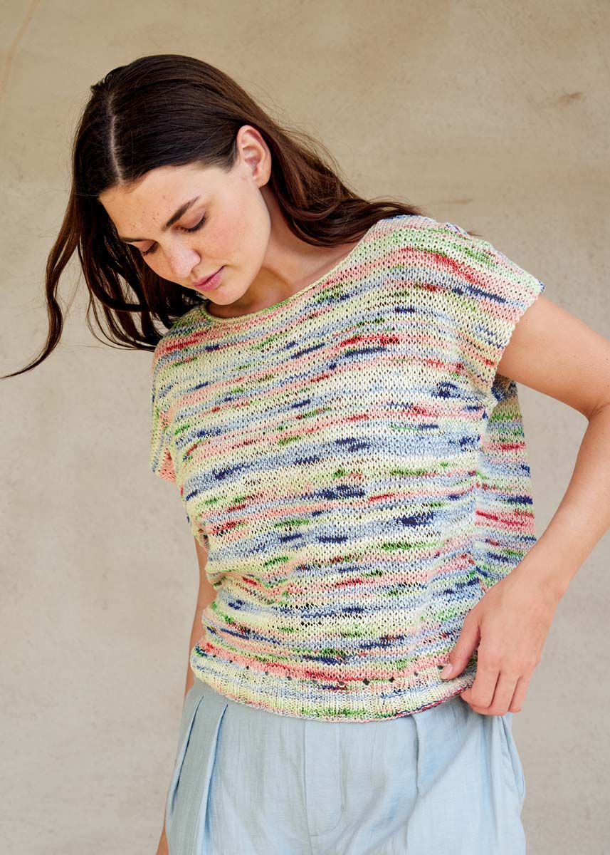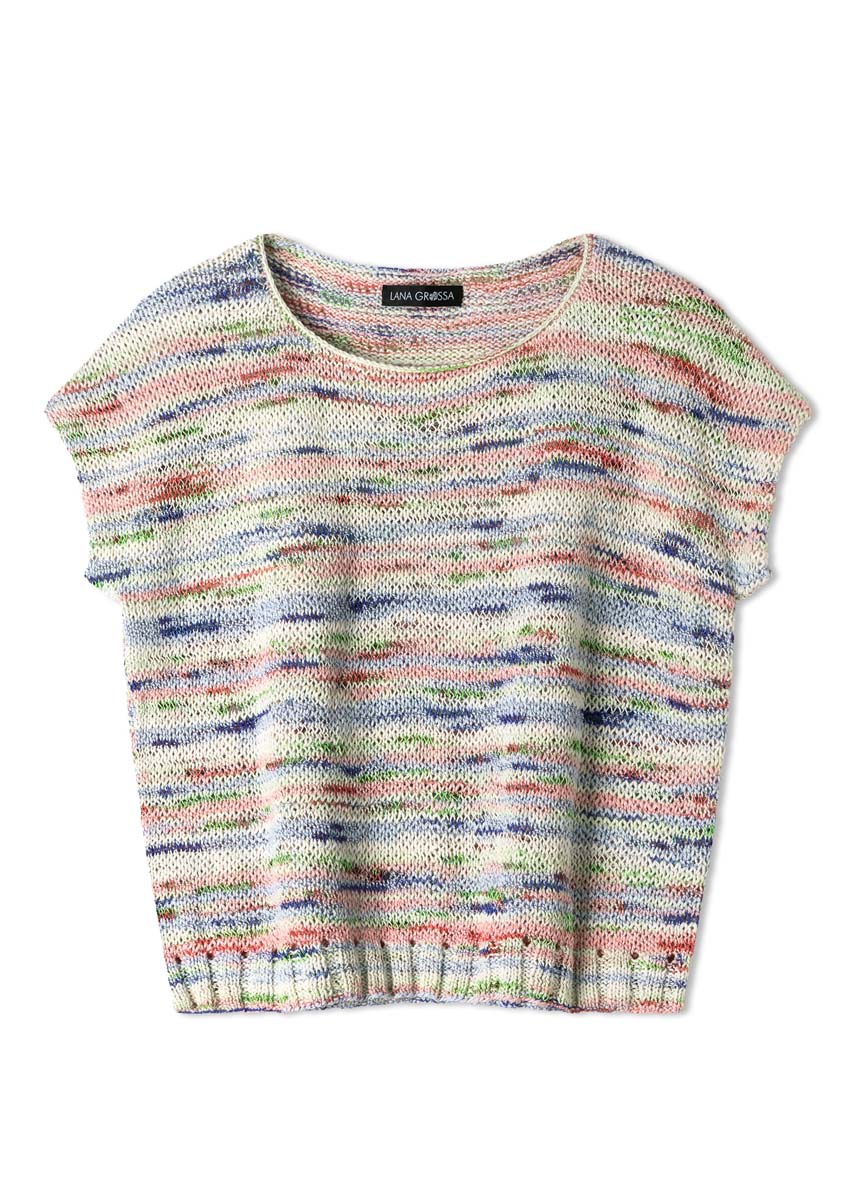 Lana Grossa „Torto“ (90% Baumwolle, 10% Polyamid, Lauflänge 120 m/50 g), 250 (300 - 350) g in Rohweiß/Rosa/ Grün/Orange/Marine/Blassgrün/Hellblau (Fb. 8); Stricknadeln Nr. 3 und Nr. 6, 1 Rundstricknadel Nr. 3, 40 cm lang.