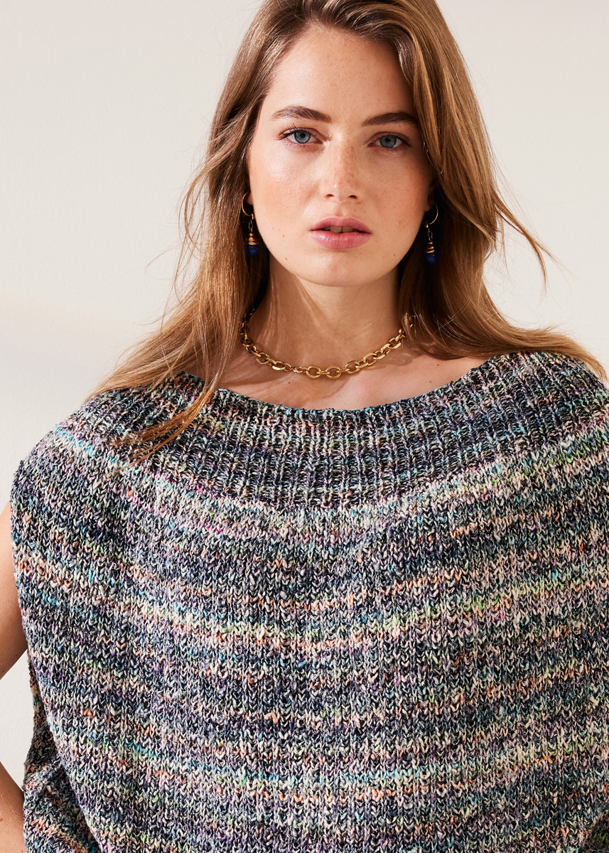 Flammen- und Bouclé-Effekte verpassen diesem Top eine spannende Struktur. Wir lieben auch seine Oversize-Form, die sich ganz einfach stricken lässt.