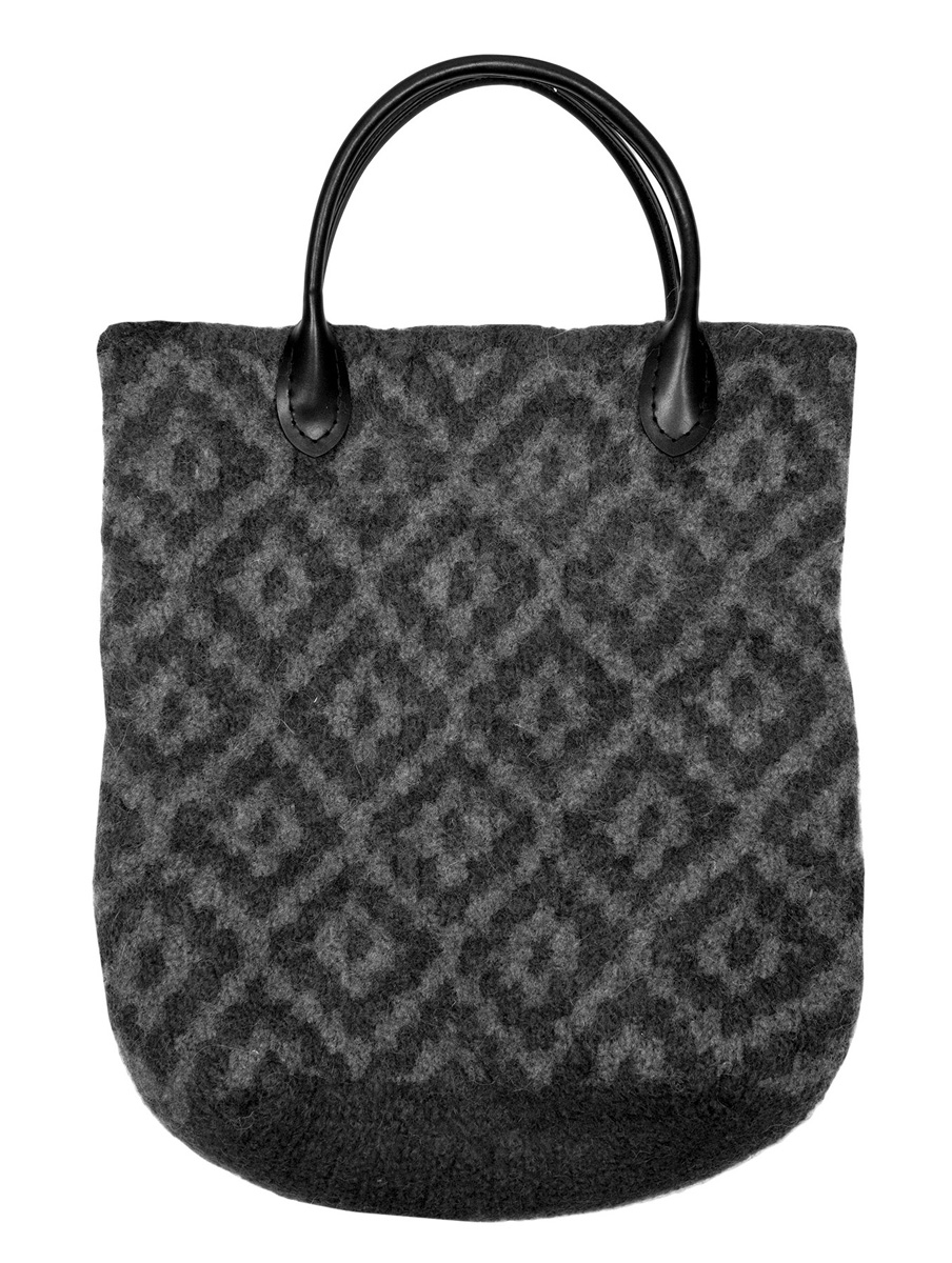 Lana Grossa Feltro (100% Wolle, Lauflänge 50 m/50 g), 350 g Pfl aume (Fb 54) und 300 g Dunkelgrau meliert (Fb 4), Stricknadel Nr. 9 und eine Rundnadel Nr. 9, 80 cm lang, 1 Paar schwarze Taschenhenkel Marie, 53 cm lang, Art. 615 160 von Prym.