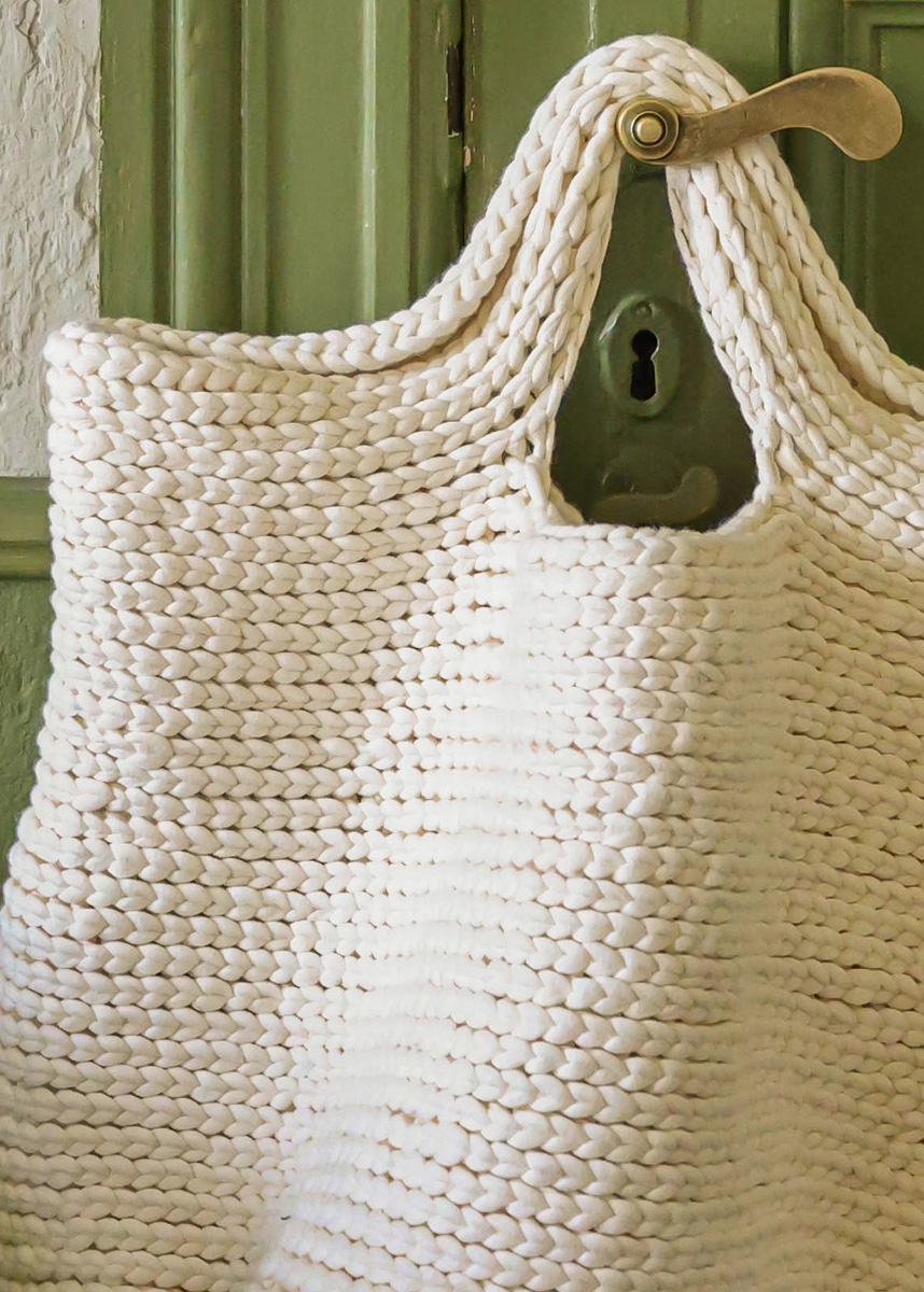 Diese lässige Tasche wird aus The Tube gehäkelt. Das neue, voluminöse Schlauchgarn ist mit weicher Watte gefüllt. Es liefert schnelle Ergebnisse und lässt, wie man sieht, Strukturmuster schön plastisch hervortreten.