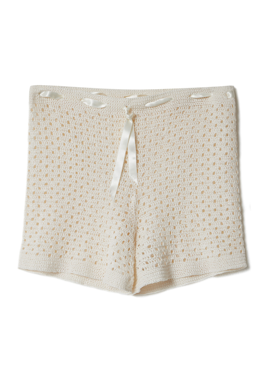 Beim cremefarbenen Set im grafischen Häkelmuster sorgt ein neues Bändchengarn für Leichtigkeit und einen dezenten Glow. Der Pulli wird bis zu den Armausschnitten in Runden gearbeitet. Die Shorts haben eine hohe Taille mit Tunnelzug, die nach Belieben reguliert werden kann.