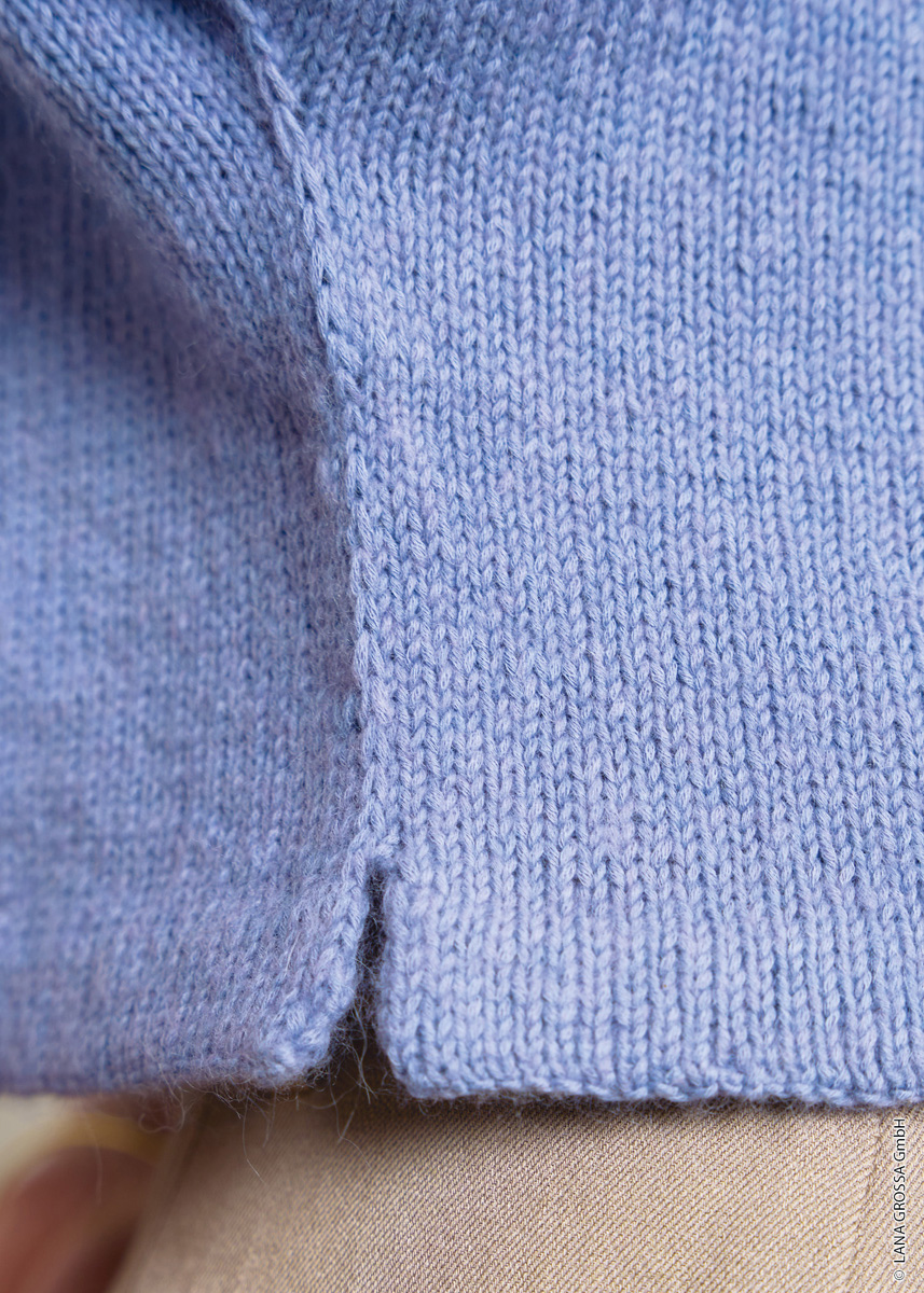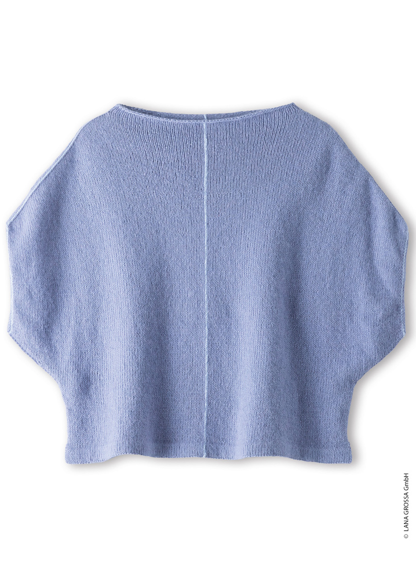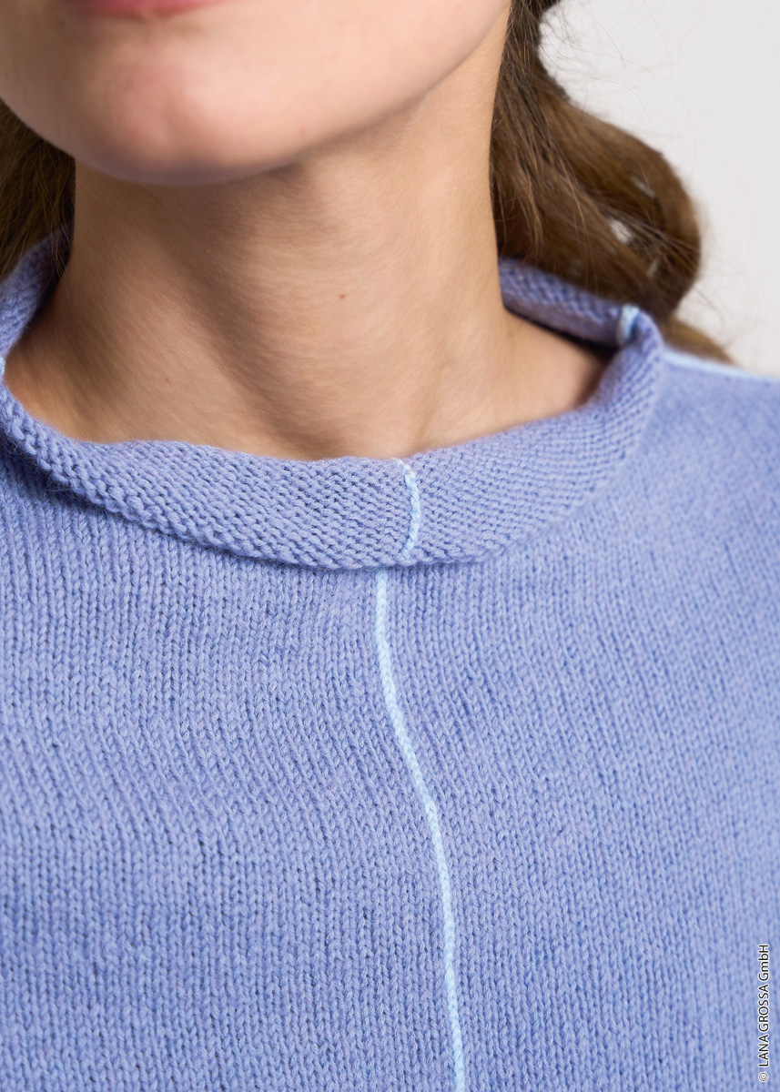Lana Grossa-Qualität "Ecopuno" (72% Baumwolle, 17% Schurwolle (Merino), 11% Alpaka, LL = 215 m/50 g): ca 200 (250) 250 (300) 300 (350) g Lilablau (Fb.214) und 50 (50) 50 (50) 50 (50) g Pastellblau (Fb. 207); je eine Rundstricknadel 3 mm und 3,5 mm, 80 - 100 cm lang eine Rundstricknadel 3,5 mm, 40 - 60 cm lang Häkelnadel 3 - 3,5 mm und Maschenmarkierer.