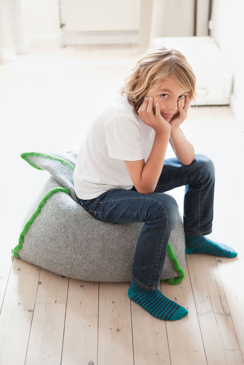 Lana Grossa Feltro (100% Schurwolle, Lauflänge 50 m/50 g), 1350 g Grau meliert (Fb 3); und 250 g Giftgrün (Fb 59); Stricknadeln Nr. 8, 1 Häkelnadel Nr. 7, Nähnadel und passendes Nähgarn, Füllung: 8 kg Dinkelspelz, ca. 7 Euro, Schmutzfangtücher aus dem Einzelhandel.
