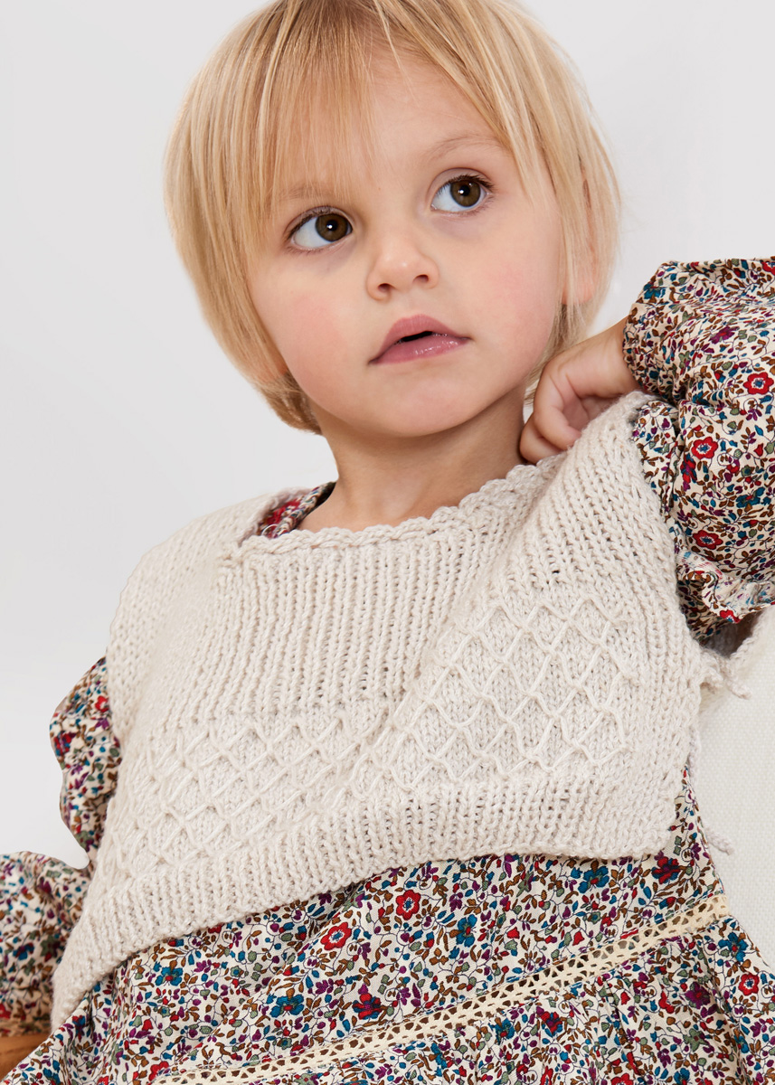 Lana Grossa Alta Moda Cotolana (45 % Schurwolle (Merino), 45 % Baumwolle (Pima), 10 % Polyamid, Lauflänge = 150 m/50 g): 100 (150) g Hellbeige (Fb 19); Stricknadeln Nr. 4; Häkelnadel Nr. 3,5; stumpfe, dicke Sticknadel.