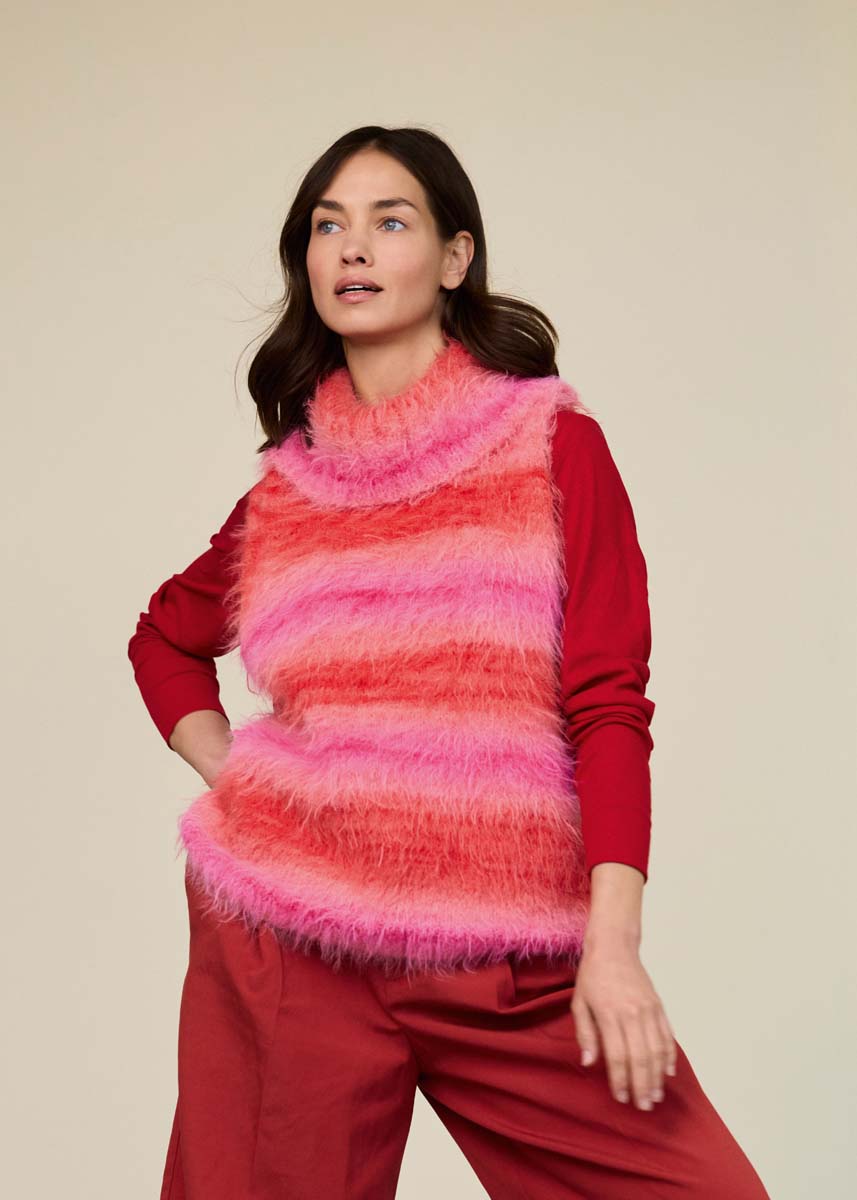 Lana Grossa-Qualität „Basta Mista“ (50% Schurwolle (Merino), 50% Polyamid, LL = ca 100 m/50 g): 300 (400 - 400 - 500) g Rosa/Pink/Lachs/Koralle/Rot (Fb 106); Stricknadeln Nr 5 und 6; 1 kurze Rundstricknadel Nr 5.