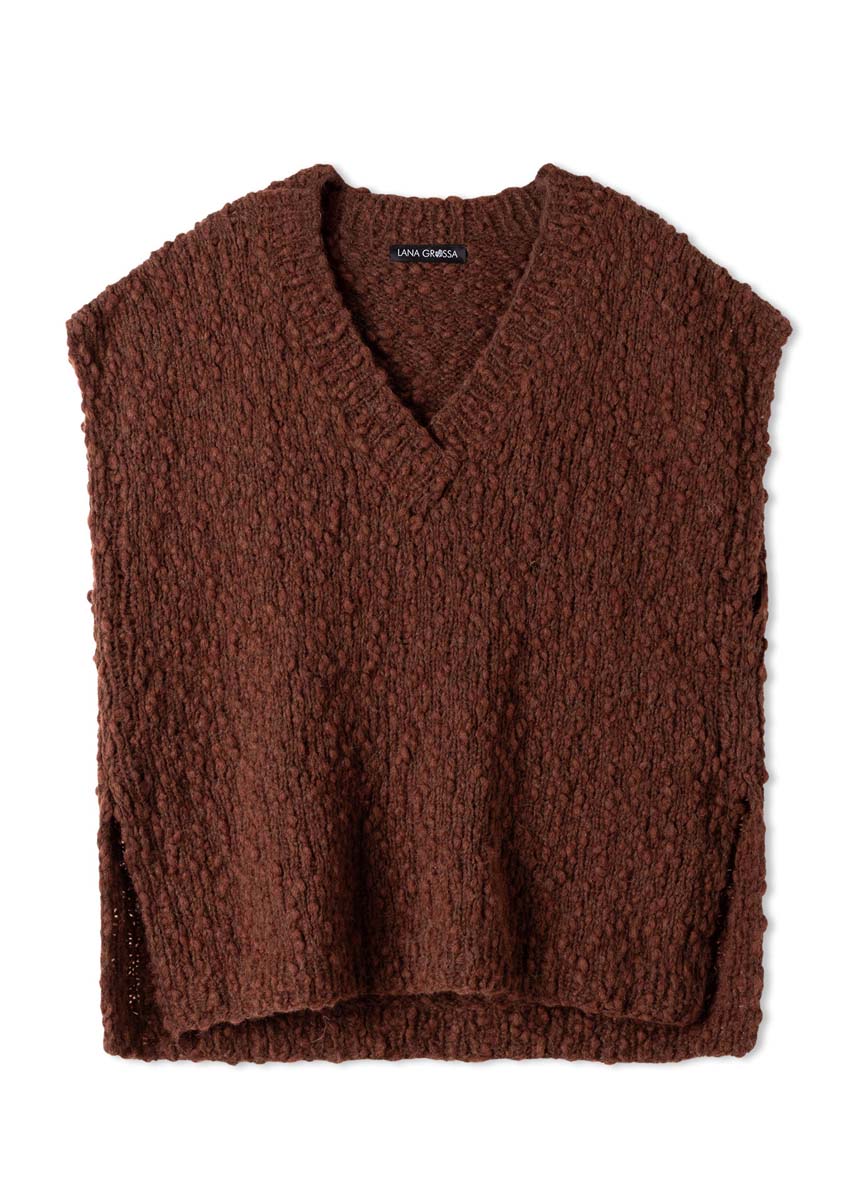 Oversized und großzügig geschlitzt: Der glatt rechts gestrickte SLIPOVER ist ein entspanntes Teil, das auch über weite Blusen passt. Wir lieben seine coole Bouclé-Struktur und den luxuriösen Braunton.