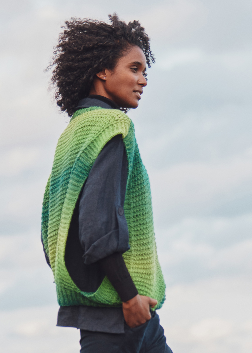 Lana Grossa-Qualität „Gomitolo Versione“ (60 % Schurwolle, 40 % Polyacryl, LL = ca 700 m/200 g): 1 (2 - 2 - 2) Knäuel = ca 200 (400 - 400 - 400) g Lind-/Mai-/Gras-/ Dunkel-/Flaschengrün (Fb 447); Stricknadeln Nr 3,5 und 4.