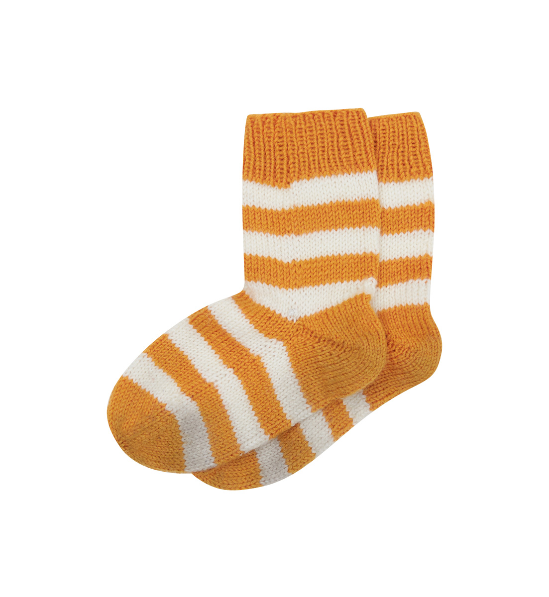 Lana Grossa Meilenweit 50G (80% Schurwolle, 20% Polyamid, Lauflänge 210 m/50 g), 50 g Curry (Fb 1390) und 50 g Rohweiß (Fb 1113); 1 Spiel Stricknadeln Nr. 3.