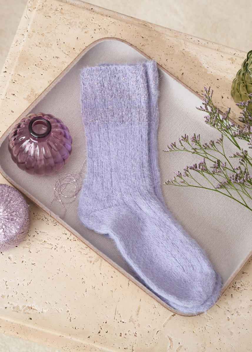 Lana Grossa-Qualität Cosy Socks (70% Schurwolle (Merino), 30% Polyamid, LL = ca. 400 m/100 g): 100 g Fliederlila (Fb 3) und Glamour (55% Polyamid, 45% Polyester, LL = ca. 115 m/25 g): 25 g Graulila (Fb 2); ein Nadelspiel Nr 2,5.