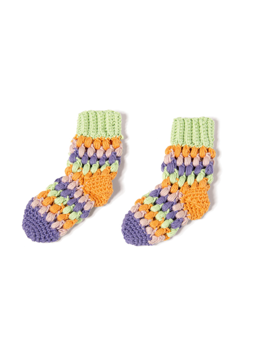 Lana Grossa Soft Cotton (70 % Baumwolle, 30 % Polyacryl; LL = 140 m/50 g): je 50 g Rosa (Fb. 6), Anthrazitviolett (Fb. 53), Orange (Fb. 59) und Lindgrün (Fb. 36); eine Häkelnadel 3,5 mm; entfernbare Markierer (alternativ Sicherheitsnadeln).