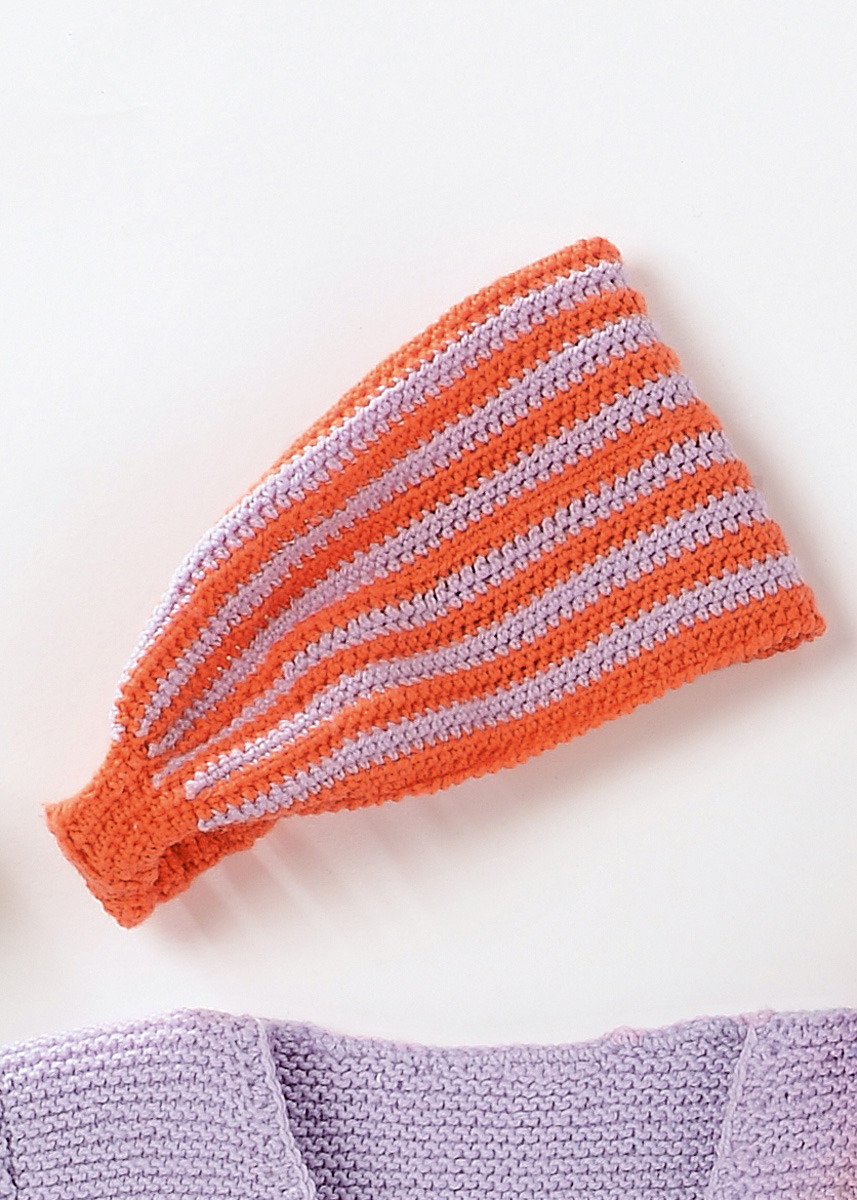Lana Grossa Cool Wool Baby (100 % Schurwolle, Lauflänge 220 m/50 g) 50 g Koralle (Fb 270) und 50 g Flieder (Fb 268); Häkelnadel Nr. 2,5; ein 2,5 cm breites Gummiband ca. 10 (10/12/12) cm lang.