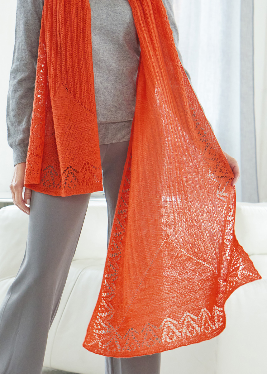Lana Grossa-Qualität „Cool Wool Lace“ (100% Schurwolle, LL = ca. 400 m/50 g); 200 g Lachsrot (Fb 21); zwei 80–100 cm lange Rundstricknadeln Nr. 3,5; ein Maschenraffer