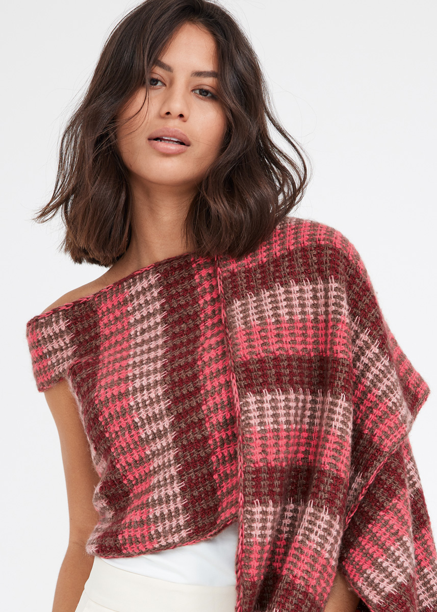 Lana Grossa Ecopuno (72% Baumwolle, 17% Schurwolle (Merino), 11% (Baby) Alpaka, Lauflänge 215 m/50 g), 300 g Dunkelbraun (Fb 17), 150 g Braunrot (Fb 31), 150 g Lachs (Fb 39) und 100 g Pfirsich (Fb 7); je 1 tunesische Häkelnadel Nr. 6,5 und 7 mit Verlängerung von Knit Pro, 1 Maschenmarkierer.