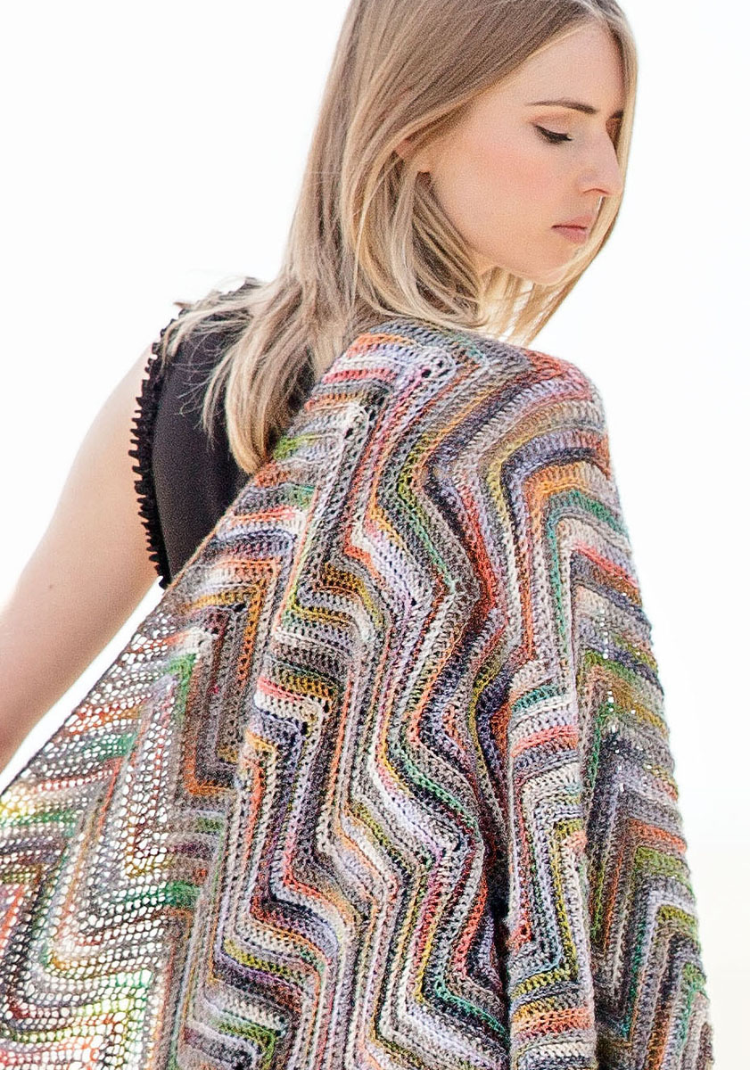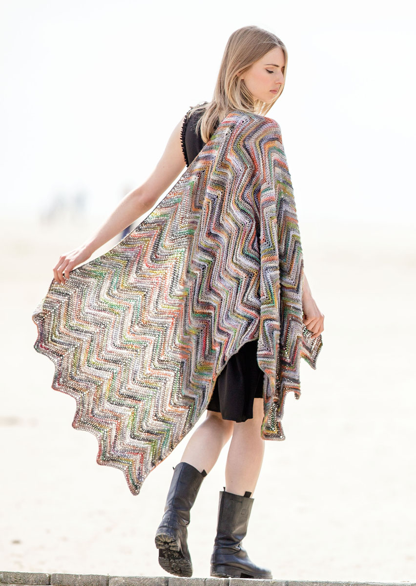Lana Grossa-Qualität „Gomitolo 200“ (50 % Schurwolle, 50 % Polyacryl, LL = ca. 700 m/200 g), 400 g Orange/Zitrusgelb/Hellgrau/Beige/Natur (Fb 208). 1 Häkel-Nd Nr. 6.