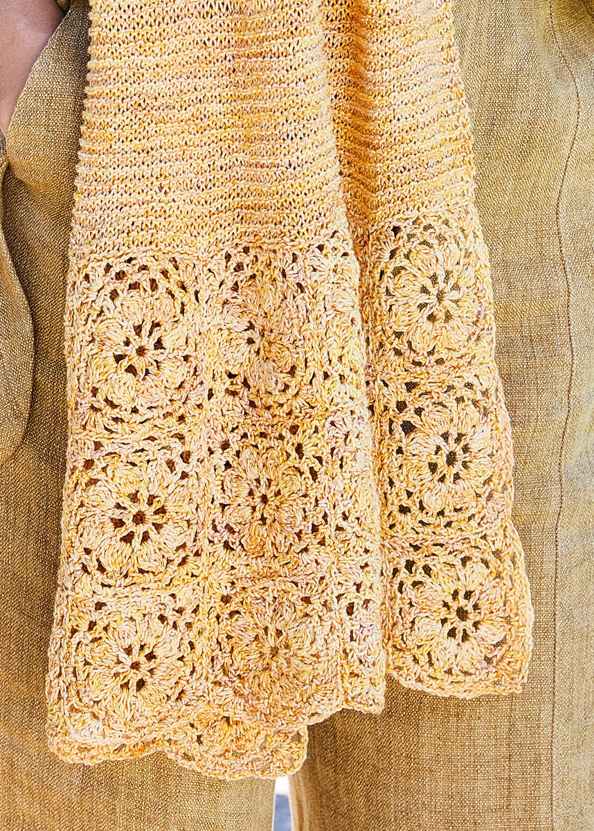 Zwei Rechtecke aus je 21 gehäkelten Blüten bilden die Enden der Stola. Dazwischen wird kraus rechts gestrickt.