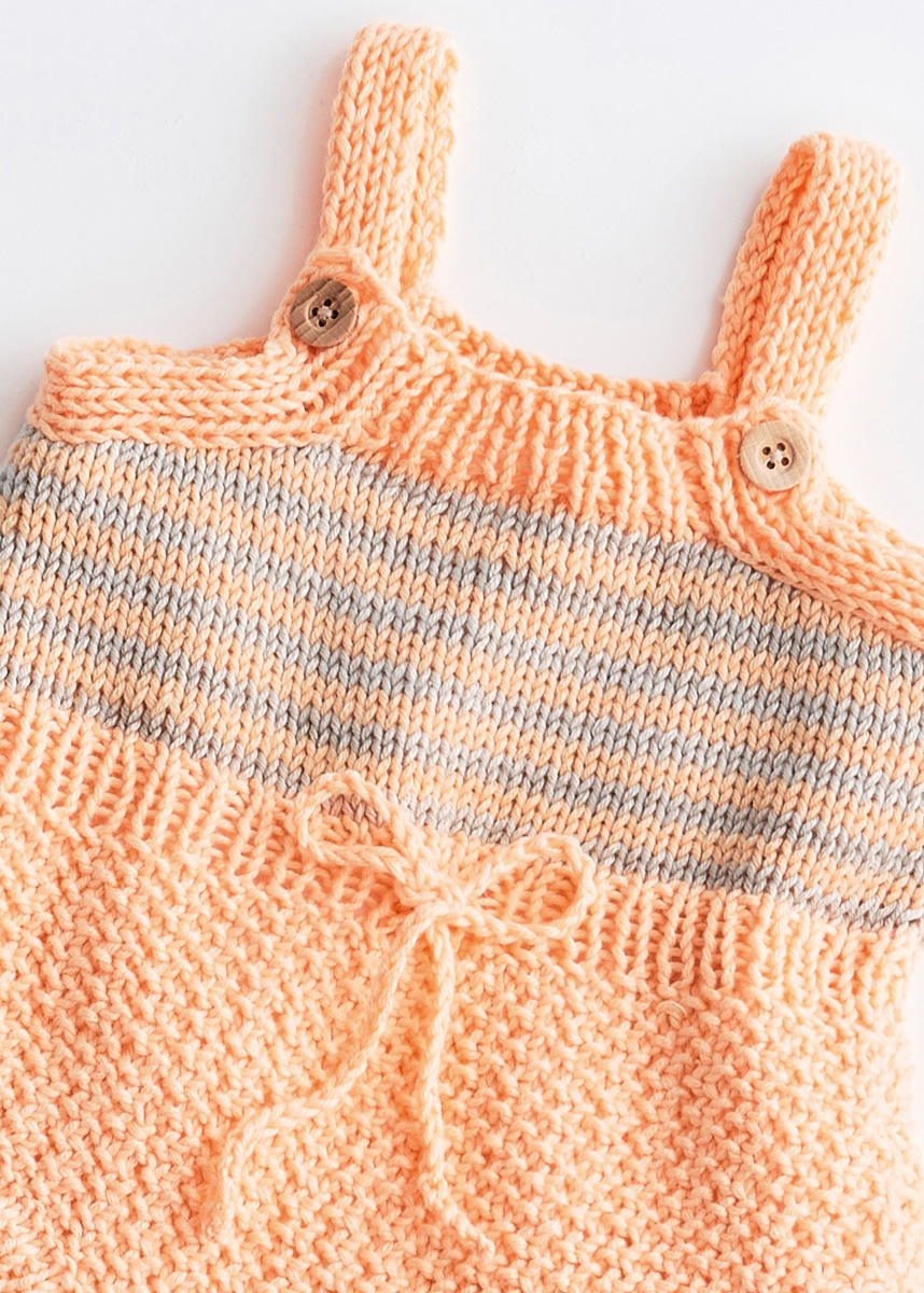 Lana Grossa Soft Cotton (70 % Baumwolle, 30 % Microfaser, Lauflänge 140 m/50 g) 100 (100/100/150) g Apricot (Fb 01) und 50 g Beige (Fb 03); Stricknadeln Nr. 3,5 und 4, eine 40 cm lange Rundstricknadel Nr. 3,5, Häkelnadel Nr. 4, fünf Knöpfe mit 14 mm Ø.