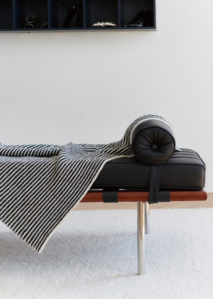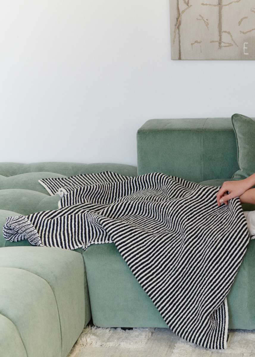 Lana Grossa-Qualität „Alta Moda Alpaca” (90 % (Baby) Alpaka, 5 % Schurwolle (Merino), 5 % Polyamid, LL = ca. 140 m/50 g): je ca. 450 g Rohweiß (Fb. 14) und Anthrazit (Fb. 13); 1 Rundstricknadel Nr. 6, 120 cm lang.