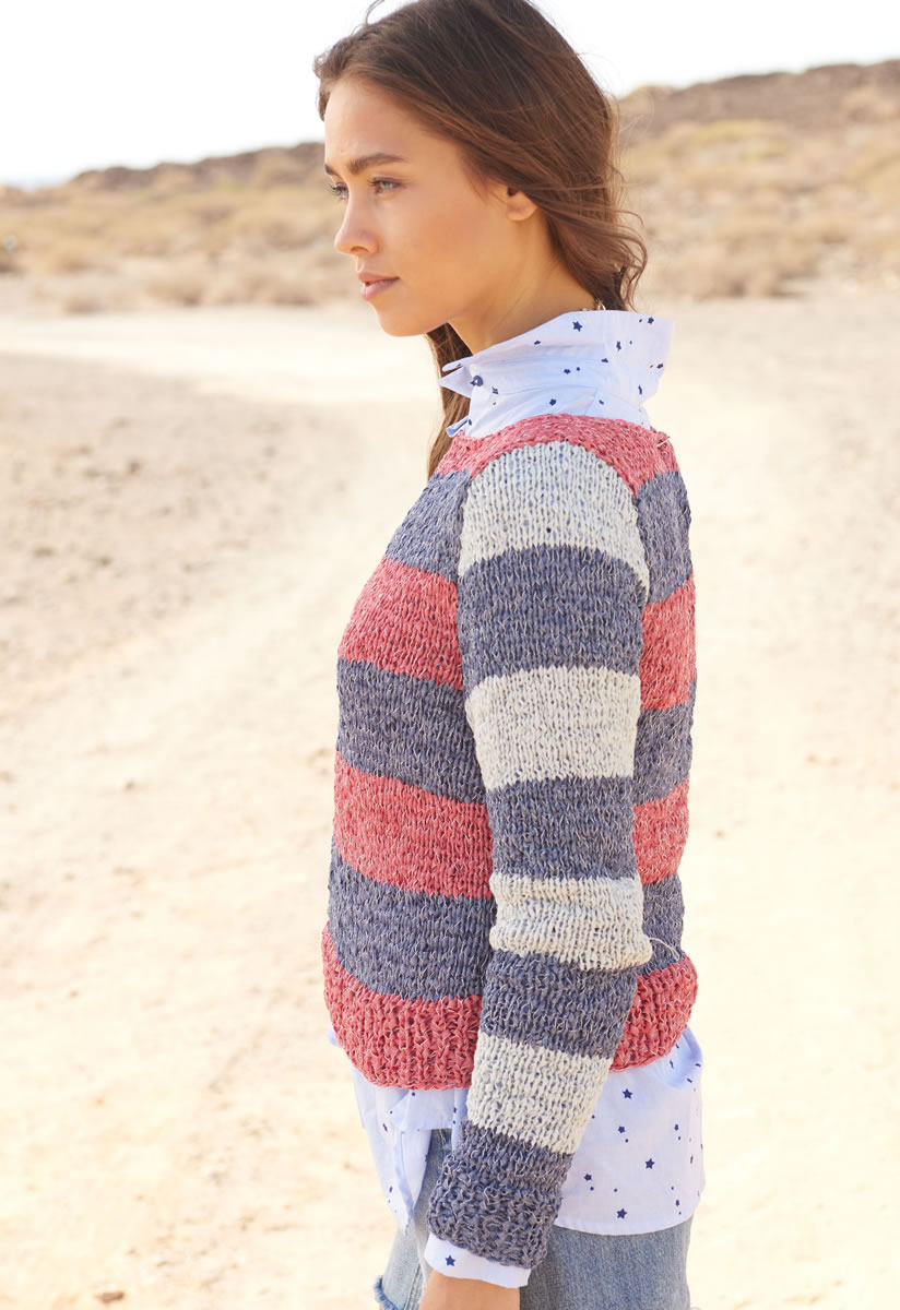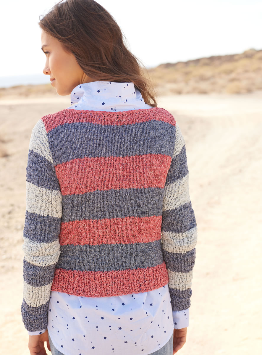 Lana Grossa-Qualität „Lunare” (58 % Polyamid, 42 % Baumwolle, LL = ca. 100 m/50 g): ca. 200 (250) g Dunkelblau (Fb. 11), je ca. 100 (150) g Rot (Fb. 21) und Lichtgrau (Fb. 16); Stricknadeln Nr. 6,5 und 7, 1 Wollhäkelnadel Nr. 6.