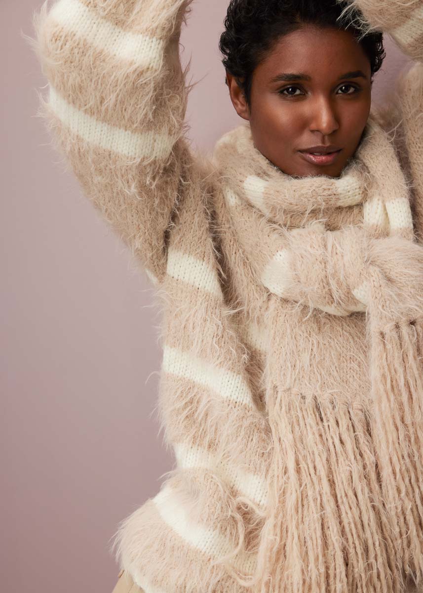Mega-Effekt, wenig Aufwand: Passagen aus flauschigen Fake Fur-Garn im Wechsel mit glattem Merino sind das Geheimnis dieses Prachtstücks. Mit geradem Schnitt und nur wenigen Zunahmen ist dieser Pulli schnell gemacht und daher auch für Anfänger bestens geeignet. Und der Schal? Der strickt sich fast wie von selbst.