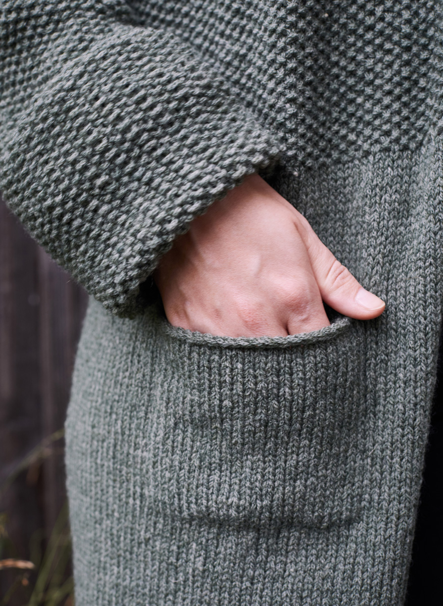 Lana Grossa-Qualität „Landlust Merino 180“ [94% Schurwolle (Merino), 6% Polyamid (Trägerfaden), LL ca. 180 m/50 g]; 650 (700 – 750 – 800) g Graugrün (Fb 235); Stricknadeln Nr. 4,5 und 5,5
