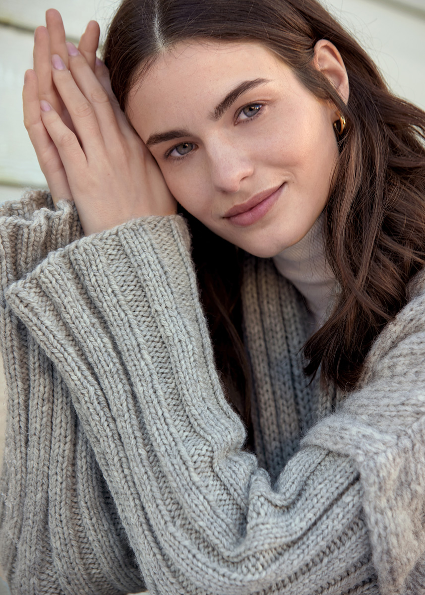 Lana Grossa-Qualität „Alpaca Moda“ (74 % (Baby) Alpaka, 13 % Schurwolle (Merino), 13 % Polyamid, LL = ca 135 m/50 g): ca 350 (400 - 400 - 450) g Hellgrau (Fb 4); und „Cool Merino Big“ (90 % Schurwolle (Merino), 10 % Polyamid, LL = ca 90 m/50 g): ca 500 (500 - 550 - 550) g Hellgrau (Fb 218); Stricknadeln Nr 6 und 7; 1 kurze Rundstricknadel Nr 7; Häkelnadel Nr 6.