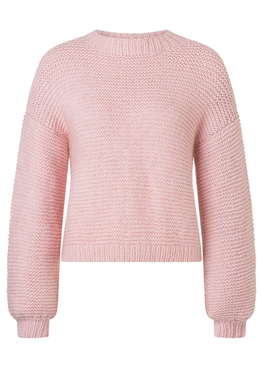 Lana Grossa Cool Wool Big (100% Schurwolle (Merino extrafine), Lauflänge 120 m / 50 g): 400 (400 - 500 - 500 - 550 – 550) g Zartrosa (Fb. 605 = Garn 1); Lana Grossa Silkhair (70% Mohair (Superkid), 30% Seide, Lauflänge 210 m / 25 g): 225 (250 - 250 - 250 - 275 - 300) g Puderrosa (Fb. 86 = Garn 2). Stricknadeln Nr. 3,5 und 5,5; kurze Rundstricknadel oder Nadelspiel Nr. 3,5 für Halsbündchen; Wollnadel; Schere; Maschenraffer oder Seil, um Maschen stillzulegen; Maschenmarkierer.