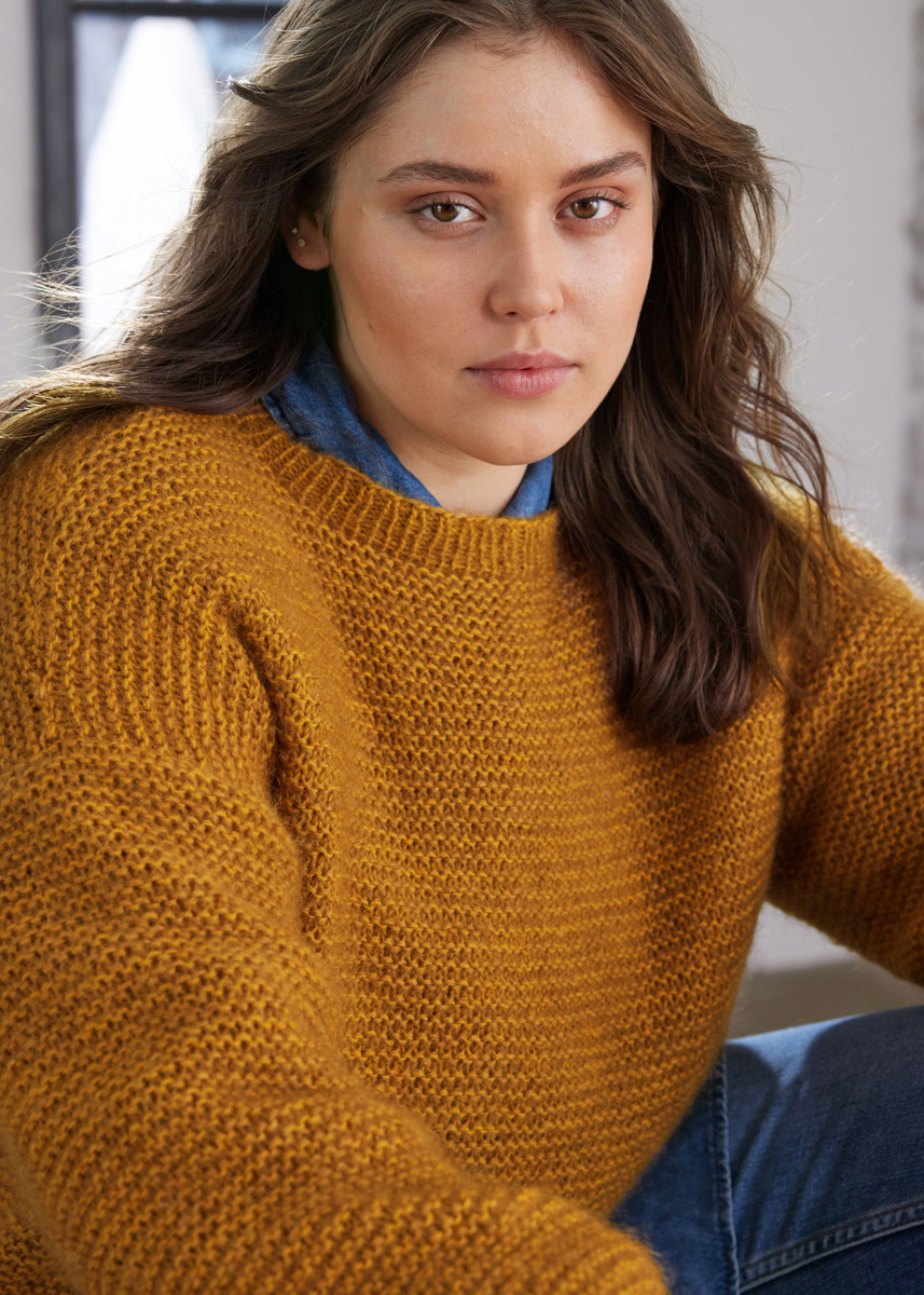 Krause Maschen und eine verkürzte, lockere Form machen CLAUDE stylisch und trotzdem schön zeitlos. Im Garn-Mix aus Silkhair und Ecopuno fällt er superleicht und fluffig aus. Verstrickst du Silkhair mit Cool Wool Big, ist der Pullover wärmer und wirkt dabei richtig winterlich.