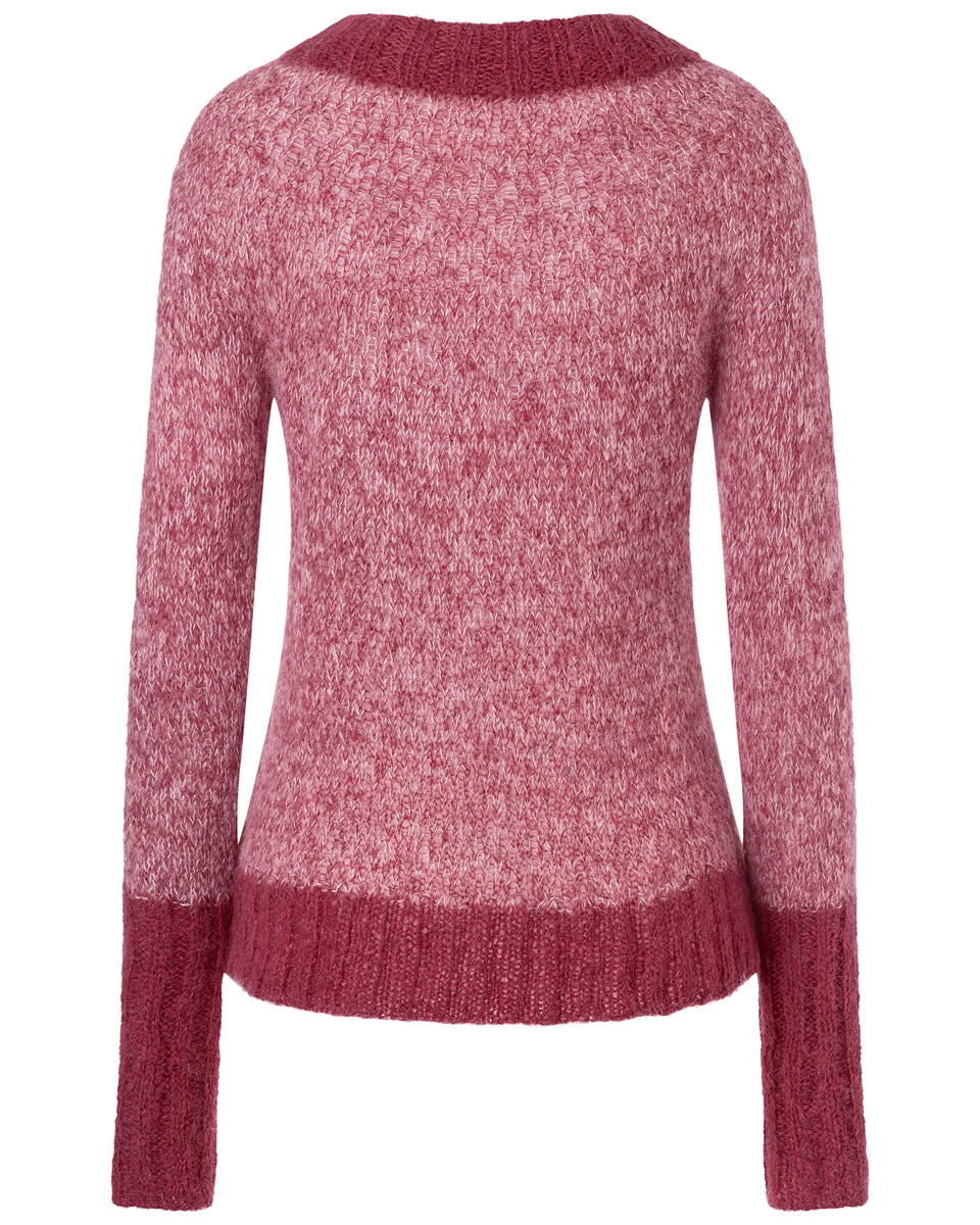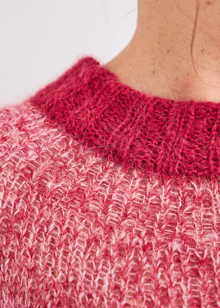 125 (125) 150 (150) 150 (175) 175 (200) g Lana Grossa Setasuri (69 % Alpaka (Suri), 31 % Seide, Lauflänge 212 m / 25 g) in der Farbe 10 Weinrot (Hauptfarbe HF), zusammen mit 100 (100) 125 (125) 150 (150) 150 (175) g Lana Grossa Setasuri (69 % Alpaka, 31 % Seide, Lauflänge 212 m / 25 g) in der Farbe 8 Rosa (Kontrastfarbe KF), zweifädig verstrickt. Nadeln: Rundnadeln 5 mm, 2 x 40 cm und 1 x 100 cm lang; Rundnadeln 6 mm, 40 cm und 100 cm lang; Häkelnadel 5 mm.