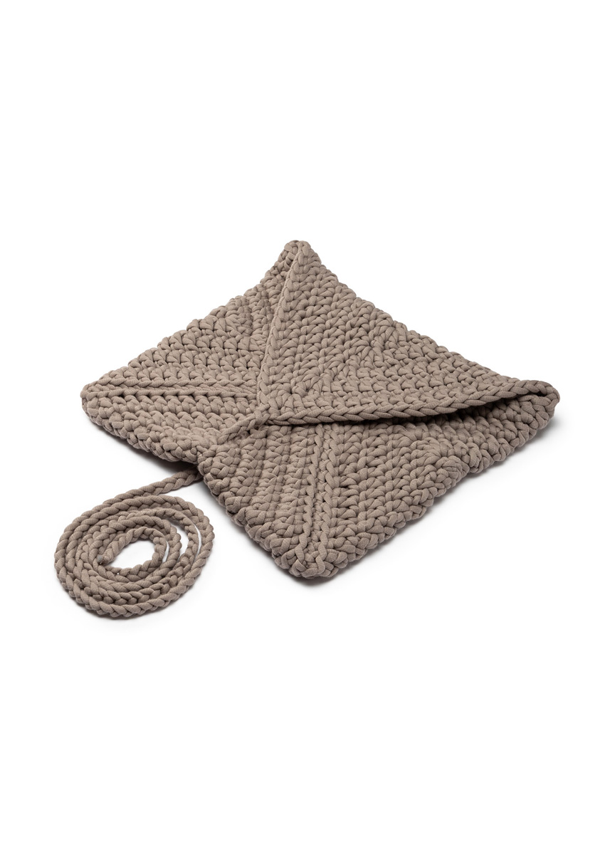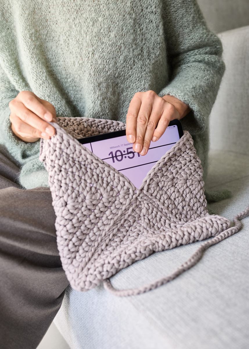 Lana Grossa-Qualität „The Tube” (60 % Baumwolle, 40 % Nylon, LL = ca. 114 m/200 g): ca. 400 g Taupe (Fb. 23); 1 Wollhäkelnadel Nr. 9, 1 Wollnadel von Lana Grossa.