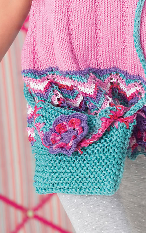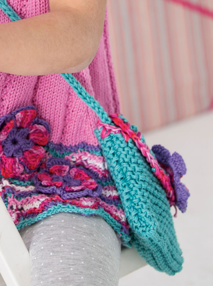Lana Grossa Qualität „Cotone” (100% Baumwolle, LL= 125 m/50 g), ca. 100 g helles Petrol (Fb 43) und je ein Rest oder 50 g Nelke (Fb 2) und Lila (Fb 50) und Lana Grossa Qualität „Cotone Print” (100% Baumwolle, LL= 125 m/50 g), ein Rest oder 50 g Rot/Pink/Flieder (Fb 307), Stricknadeln Nr. 5, je 1 Häkelnadel Nr. 3 und 4,5, 1 Druckknopf von PRYM; Art: 341 249, Silber, 15 mm.
