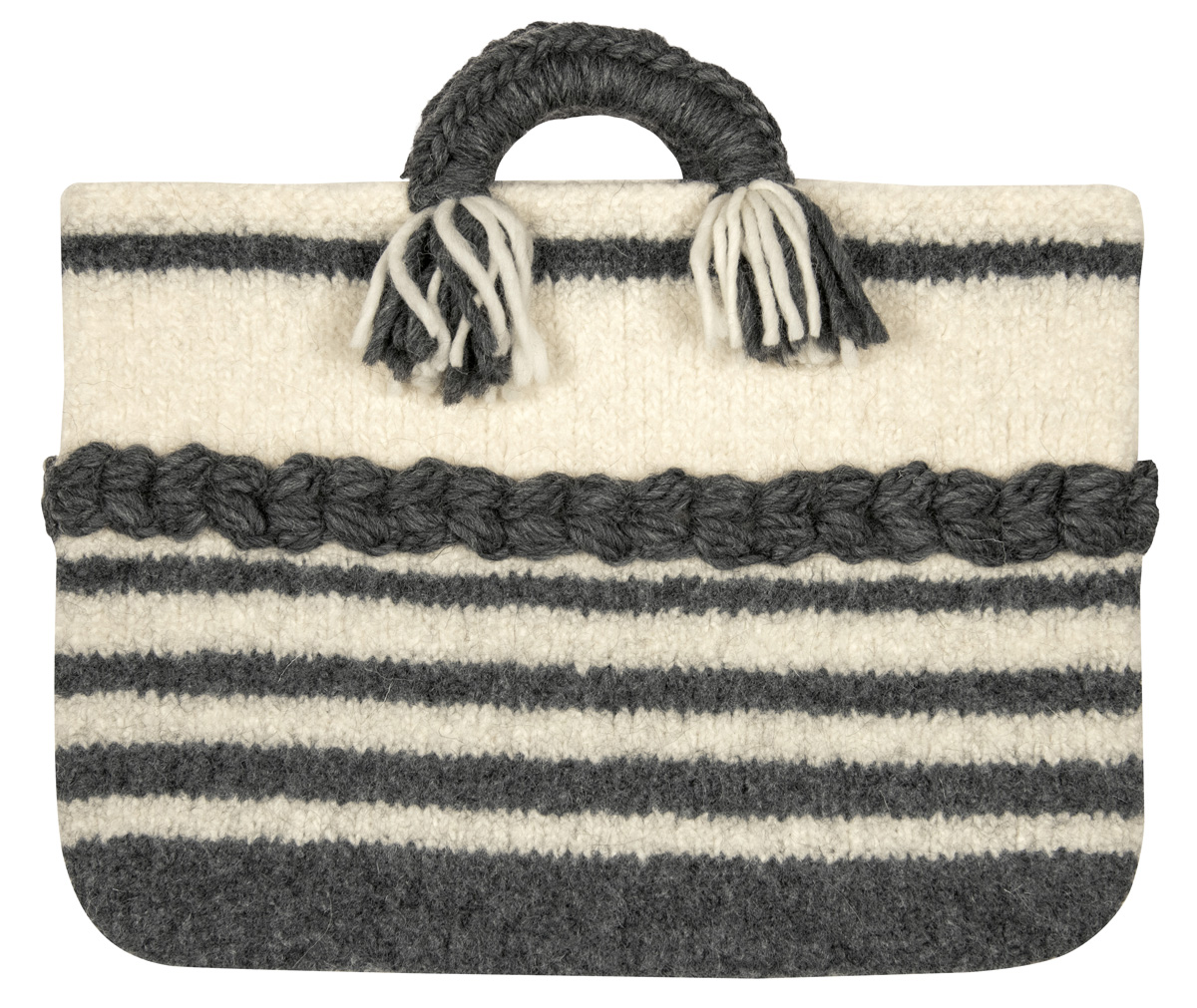 Lana Grossa Feltro (100% Schurwolle, Lauflänge 50 m/50 g), 300 g Rohweiß (Fb 1) und 250 g Dunkelgrau meliert (Fb 04); Stricknadeln Nr. 8, 1 Rundstricknadel Nr. 8, 80 cm lang, 1 Häkelnadel Nr. 6 und 9, passendes Nähgarn, Nähnadel.