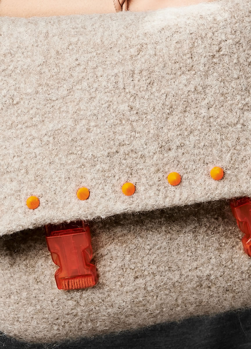 Lana Grossa Qualität „Feltro“ (100% Schurwolle, LL = 50 m/50 g), ca. 500 g Taupe (Fb 45), Stricknadeln Nr. 8, von UNION KNOPF: ca. 200 cm dreifarbiges Taschenband Art. 7400, Fb 901, 2 Plastikverschlüsse Art. 500262, Fb 42, 2 Karabinerhaken Art. 59392, Fb 851, Gr.40 mm, 2 D-Ringe, Art. 54662, Fb 851, Gr. 20 mm, 8 Nietenknöpfe, Art. 500248, Fb 42, Gr. 10 mm, 2 Knöpfe mit der orangenen Gummikordel: Art. 451091, Fb 851, Gr 23 mm, etwas Nähgarn in passender Farbe.