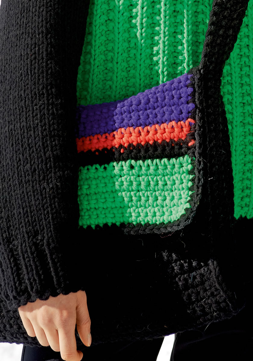 Lana Grossa-Qualität „Mille II” (50 % Schurwolle (Merino extrafine), 50 % Polyacryl (waschmaschinenfest), LL = ca. 55 m/50 g): ca. 200 g Schwarz (Fb. 15) ca. 50 g Neongrün (Fb. 504) ca. 50 g Neonorange (Fb. 503) ca. 50 g Violett (Fb. 507) 1 Wollhäkelnadel Nr. 6; 2 Druckknöpfe von Union Knopf, Art. 19630, 25 mm Ø, Fb. 80 schwarz.