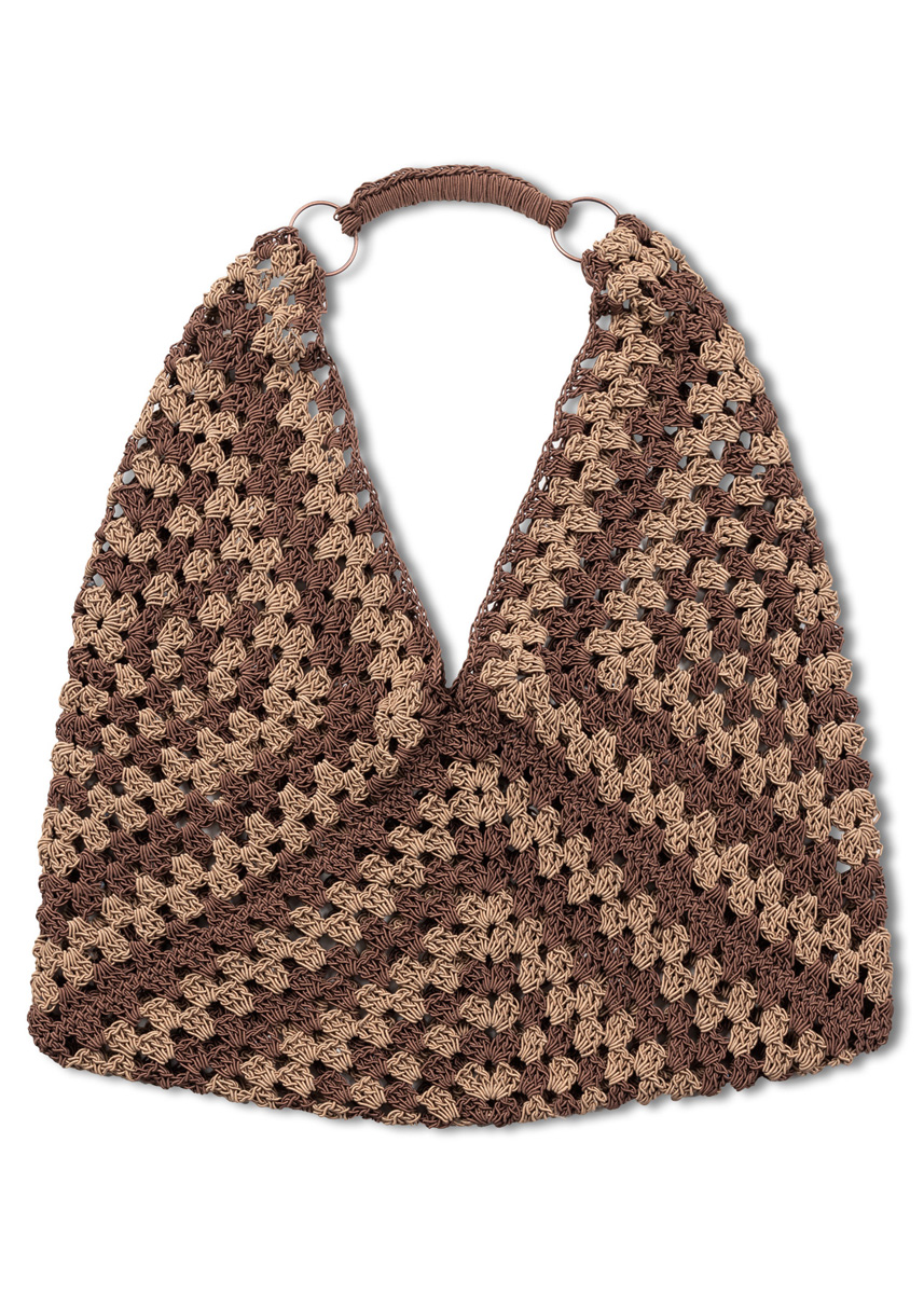 Lana Grossa-Qualität „The Core” (50 % Baumwolle, 50 % Polyester, LL = ca. 85 m/100 g): je ca. 400 g Camel (Fb. 9) und Dunkelbraun (Fb. 14); je 1 Wollhäkelnadel Nr. 4,5 und 6; 2 Metallringe in Braun, ø 40 mm.