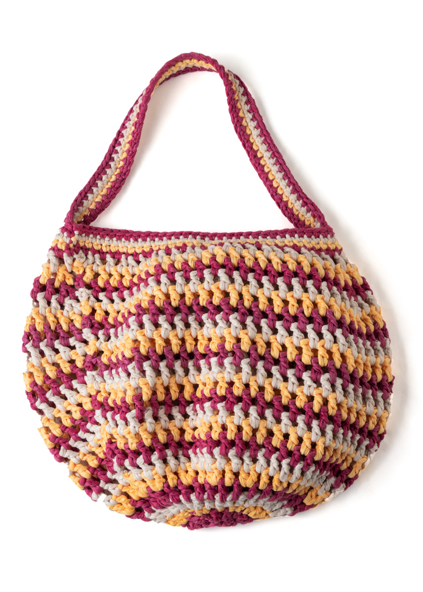 Lana Grossa-Qualität „The Paper” (70 % Polyester, 30 % Viskose, LL = ca. 100 m/100 g): je ca. 100 g Beige (Fb. 2), Bordeaux (Fb. 13) und Dottergelb (Fb. 15); 1 Wollhäkelnadel Nr. 6; 1 Annähdruckknopf in Silber aus Metall, ø 27 mm.